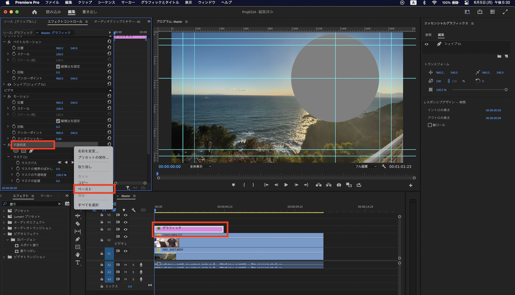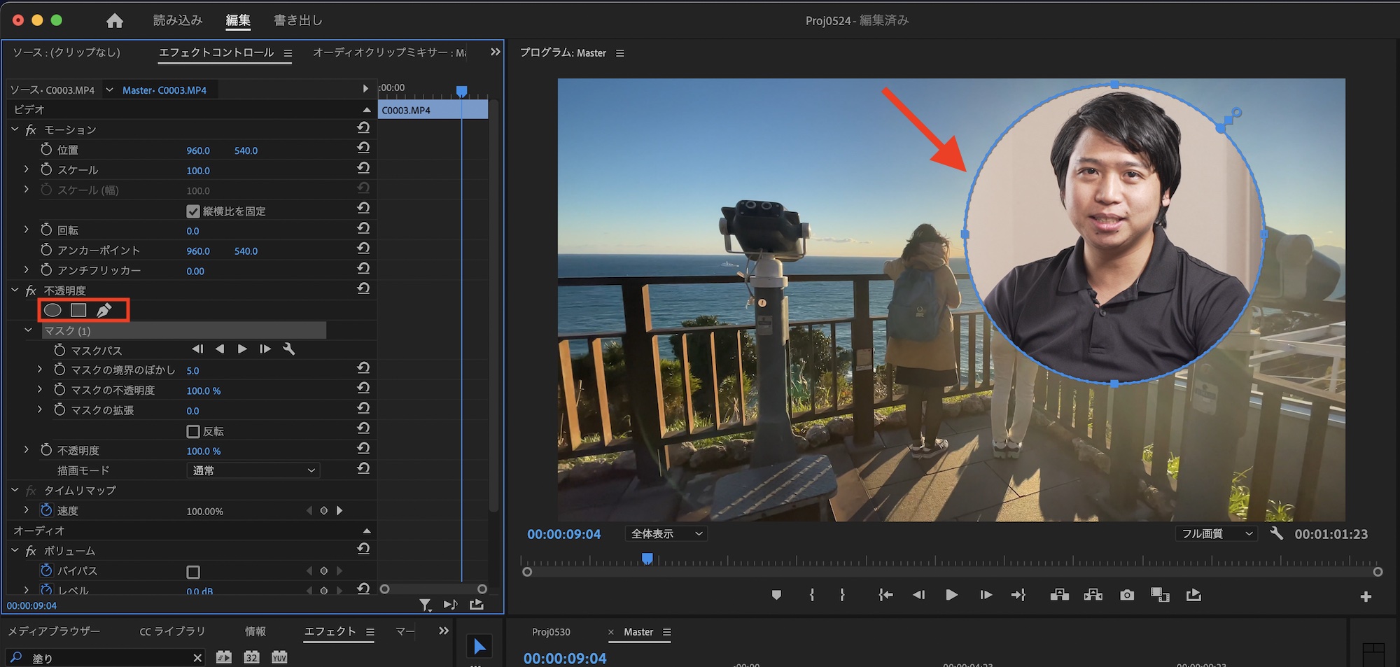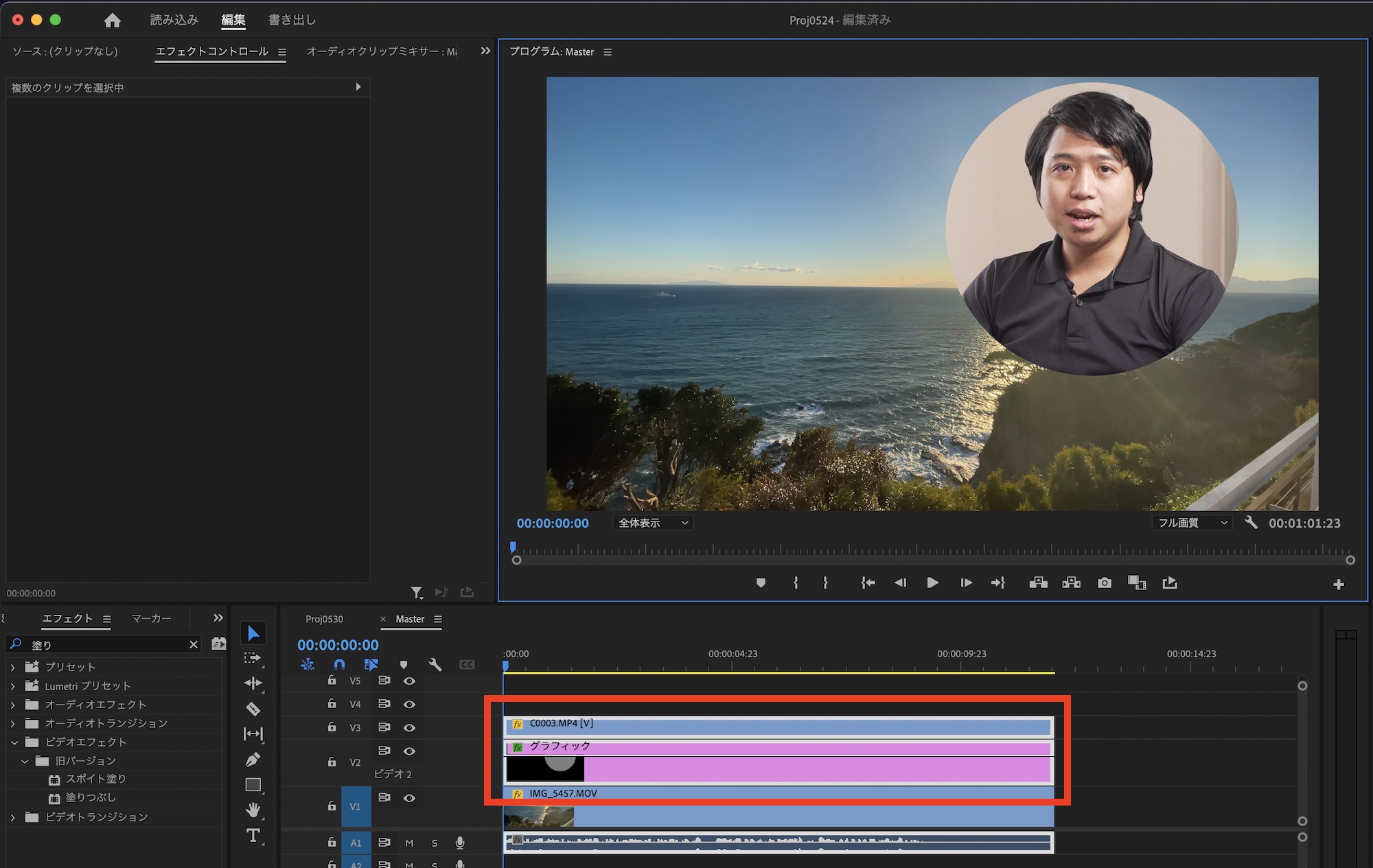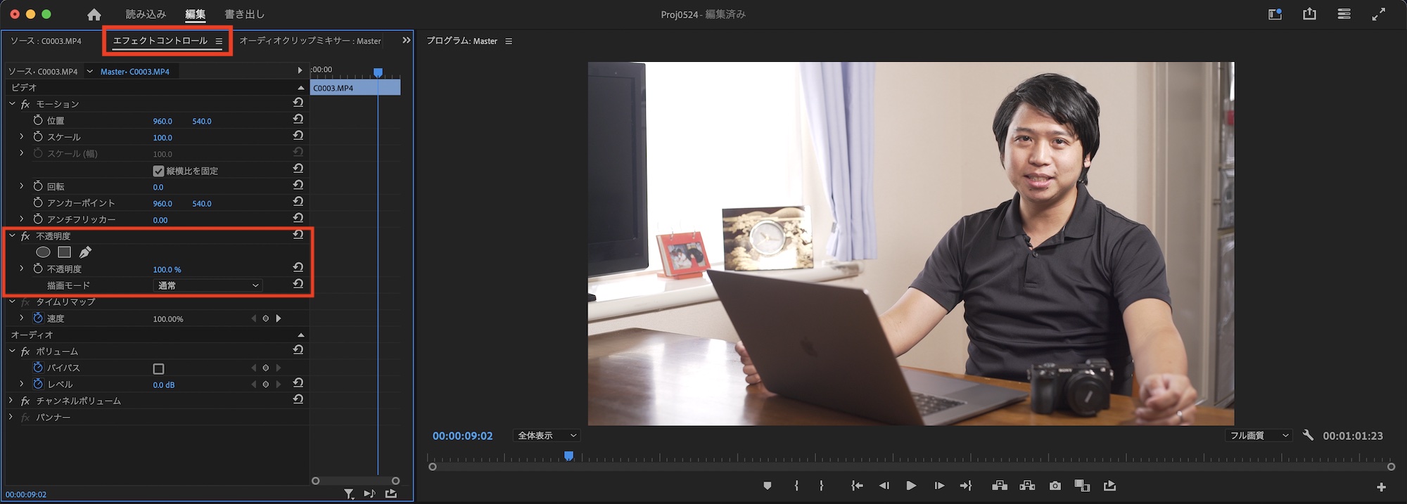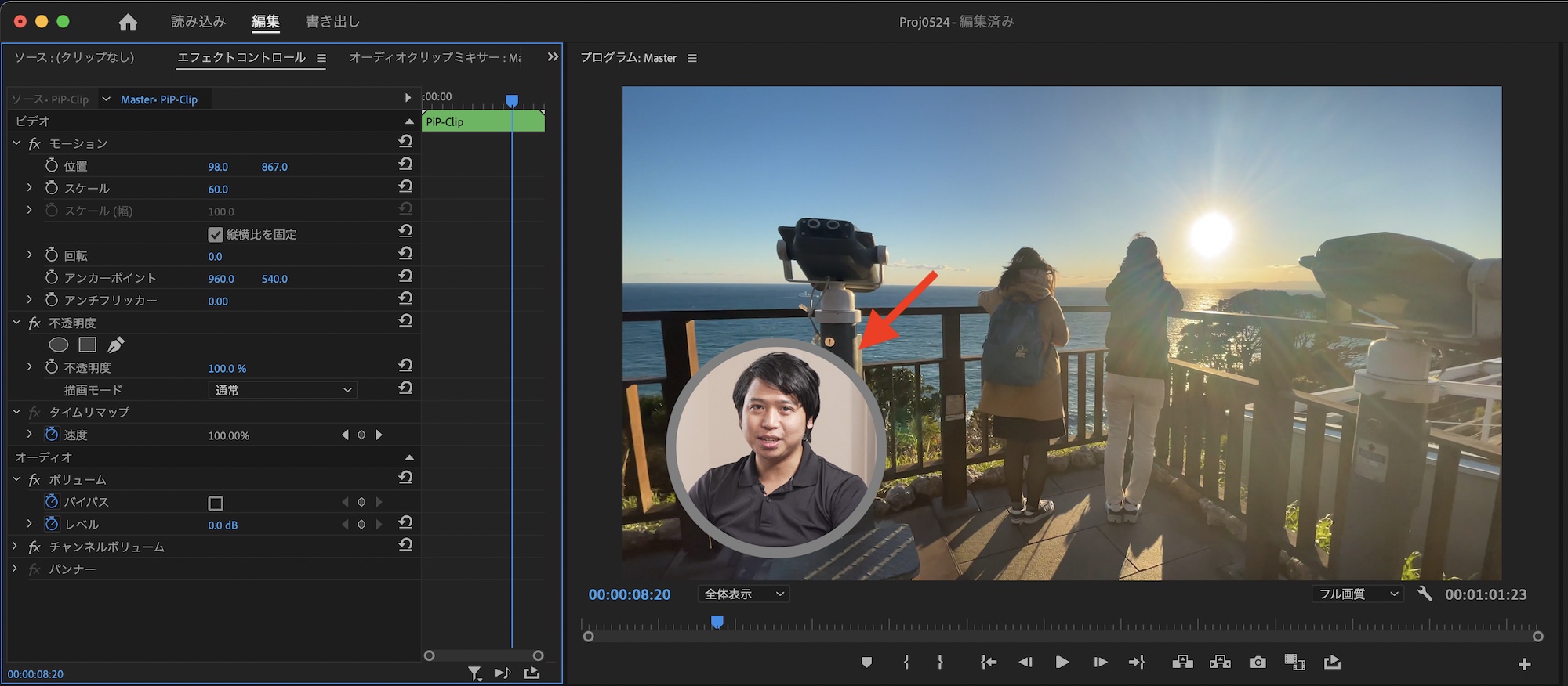 ピクチャー・イン・ピクチャーを適用するクリップを選択し、エフェクトコントロールパネルの「不透明度」の項目に移動します。