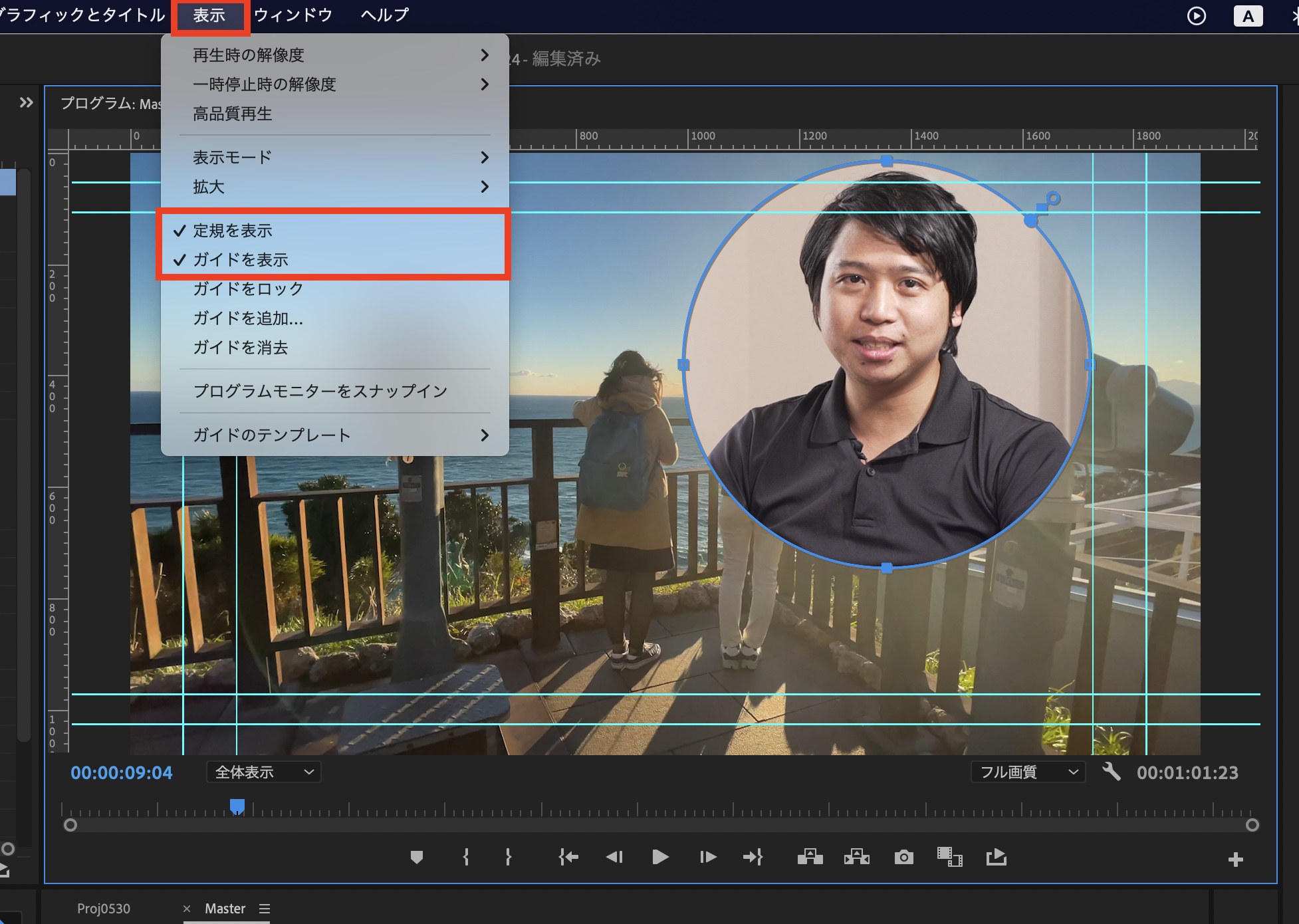 プログラムモニターを選択し、上部メニューの「表示」から「定規を表示」と「ガイドを表示」を選択し、プログラムモニターに定規とガイドを表示します。
