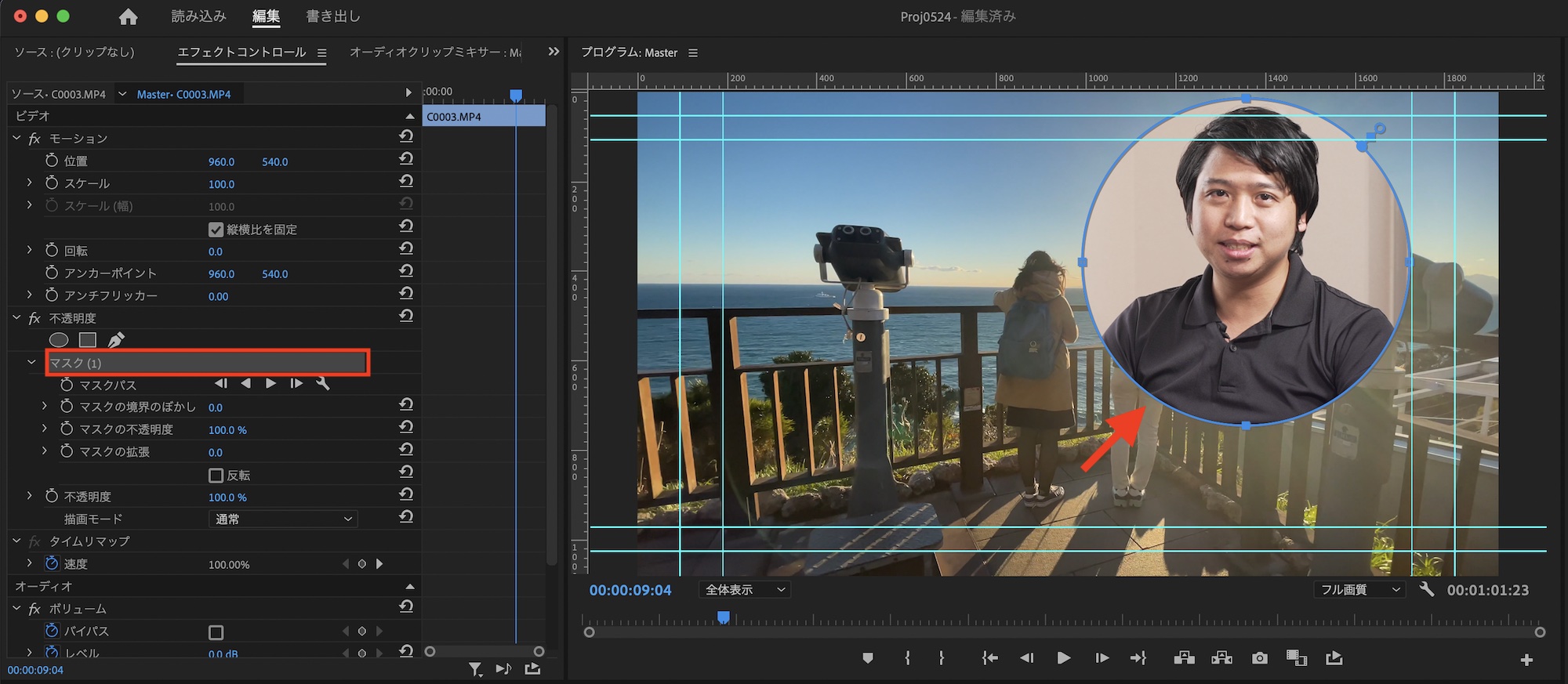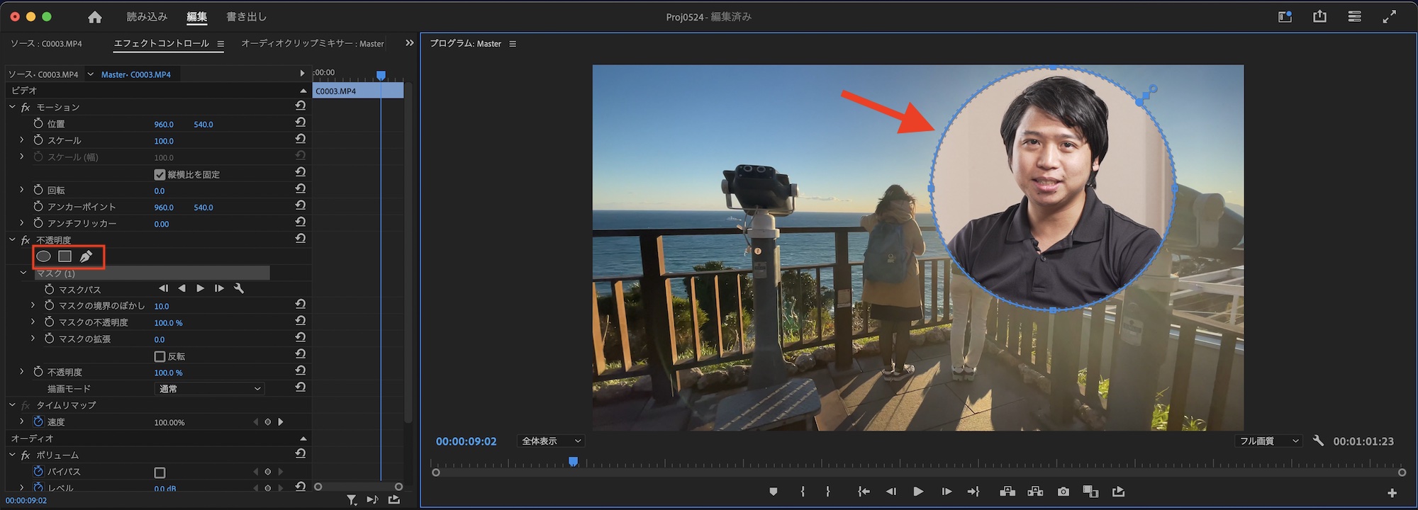 PiPのクリップのエフェクトコントロールパネルの中にある「不透明度」の「マスク」を選択し、マスクパスが表示されている状態にします。