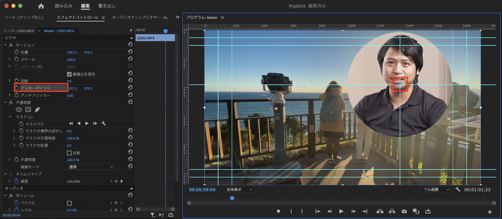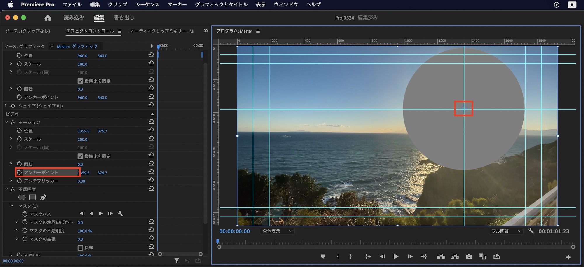 続けて「ビデオ」、「モーション」の中にある「アンカーポイント」を選択して、プログラムモニター上で先程作成したガイドの中心点にアンカーポイントが来るように調整します。「グラフィック」、「ベクトルモーション」の中にもアンカーポイントがありますが、そちらは変更しません。