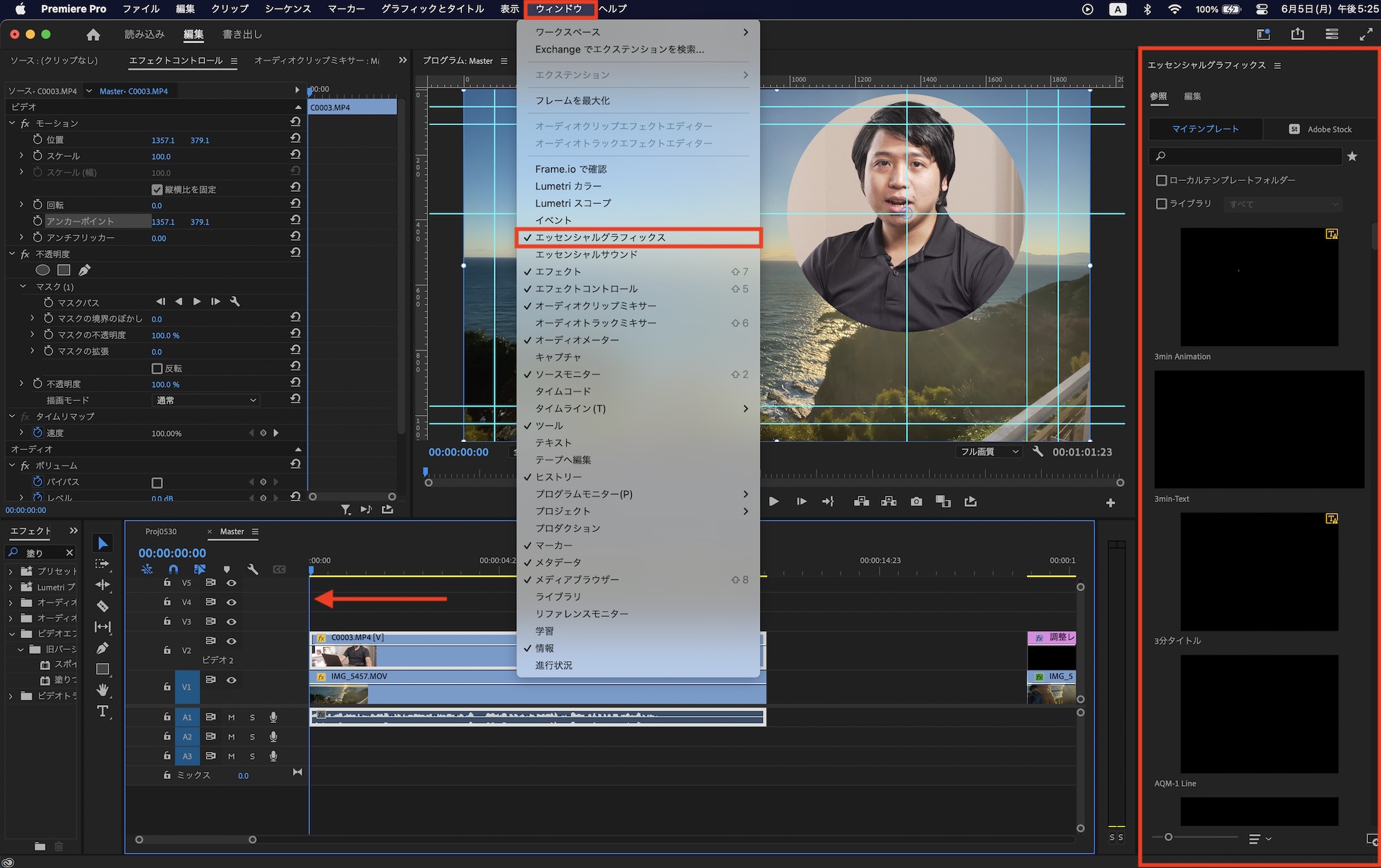 次に上部メニュー「ウィンドウ」から「エッセンシャルグラフィックス」を選択し、再生インジケータをPiPクリップが始まるタイミングに動かします。