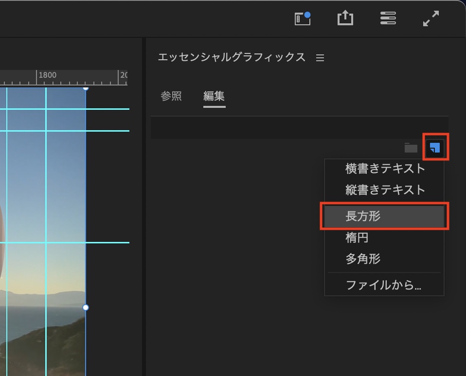 エッセンシャルグラフィックスタブの「編集」から新規レイヤーアイコンをクリックし、「長方形」を選択して、シェイプをシーケンスに追加します。
