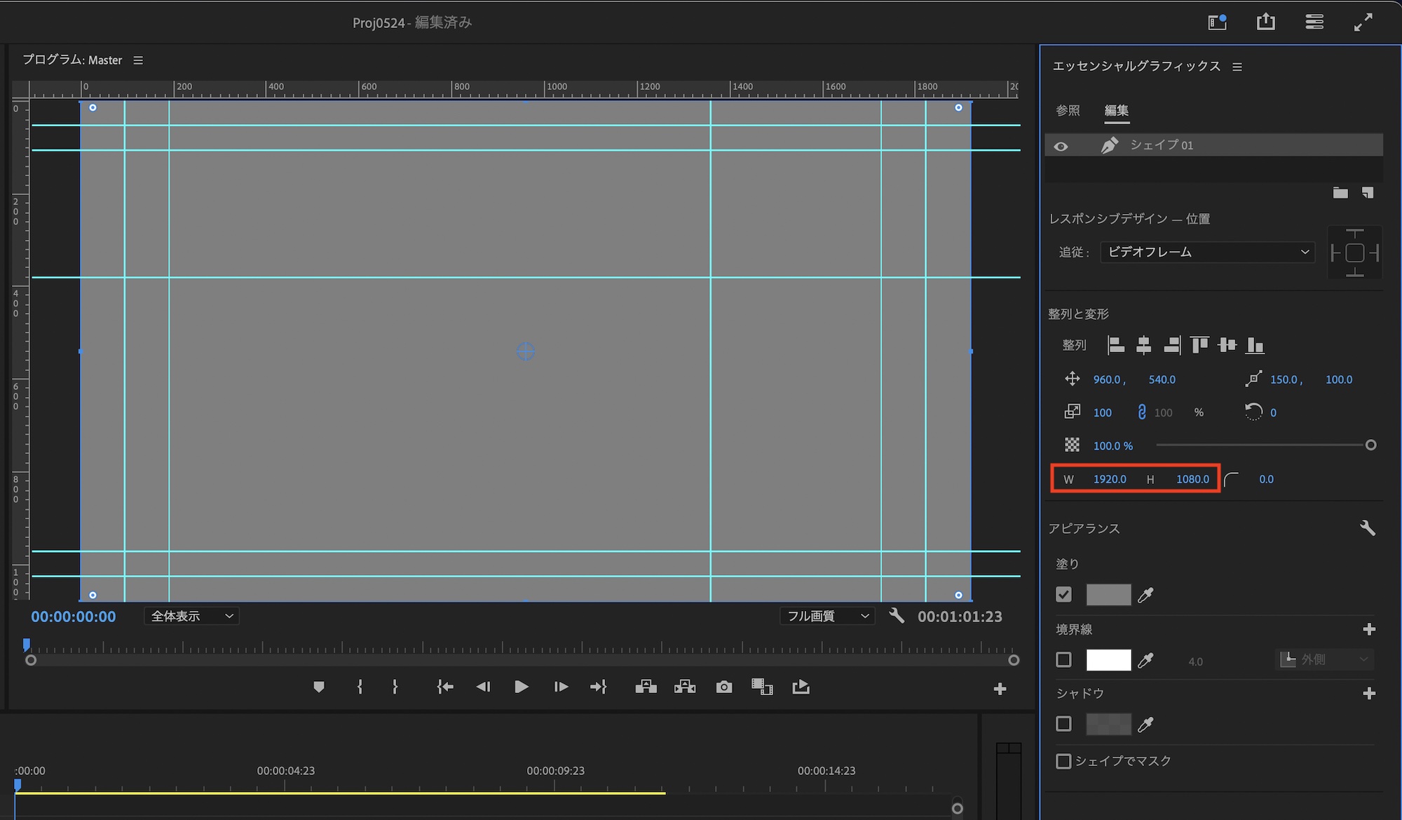 シェイプのサイズをシーケンス設定のものと同じ様にします。今回は1920x1080のフルHDのシーケンスなので、「W: 1920」、「H: 1080」にしました。