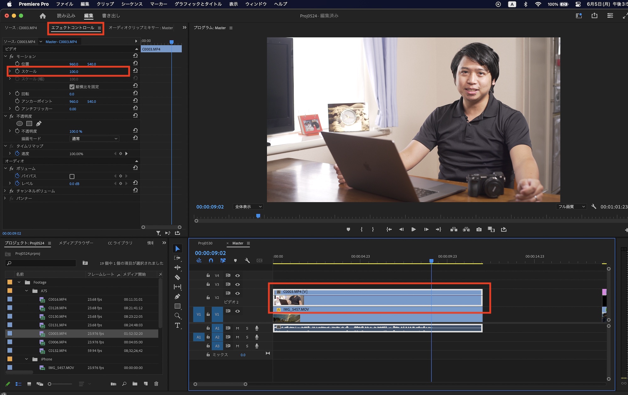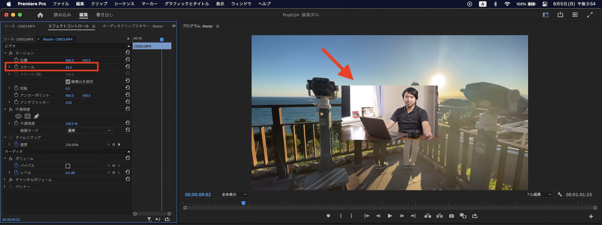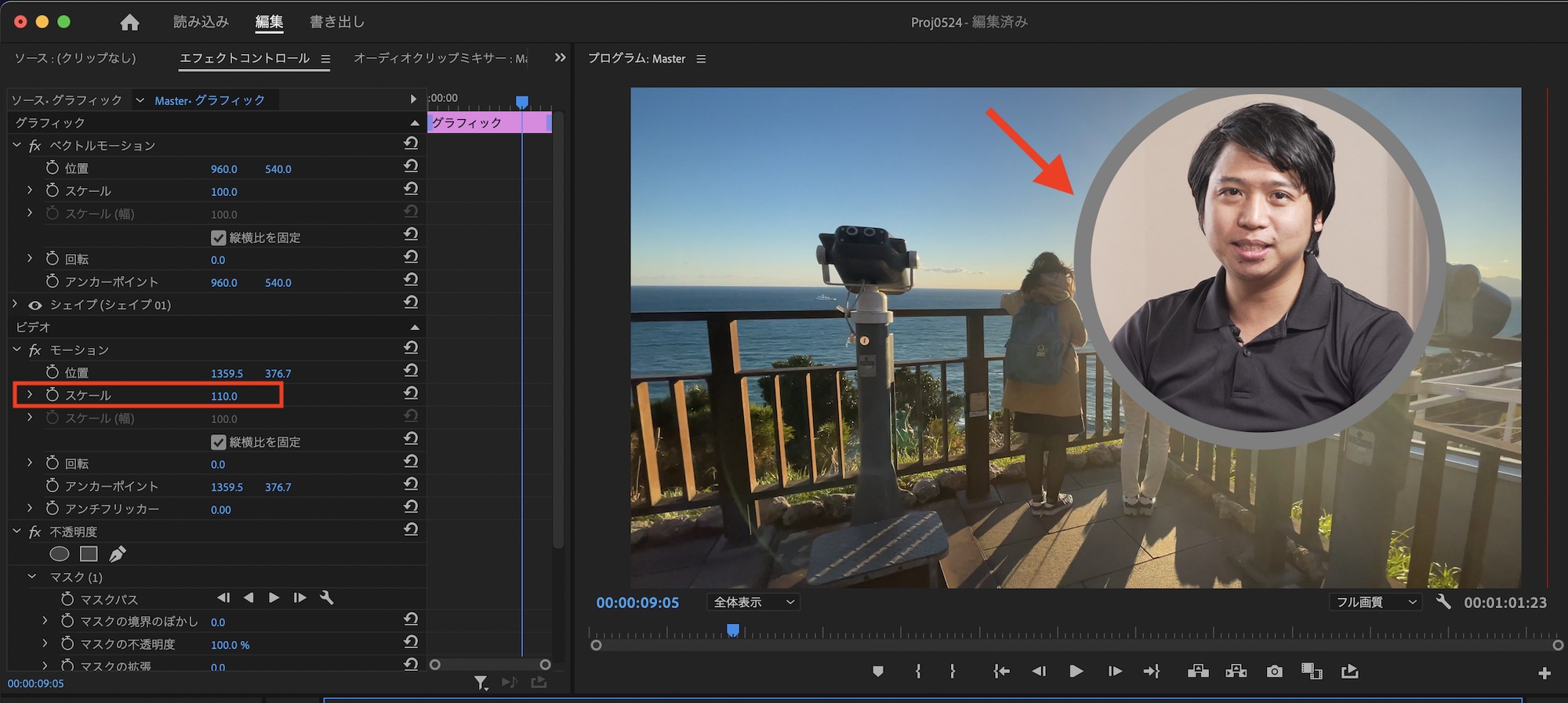 まずはシンプルな方法です。ピクチャー・イン・ピクチャーを行うクリップを選択し、エフェクトコントロールパネルの「スケール」に移動します。