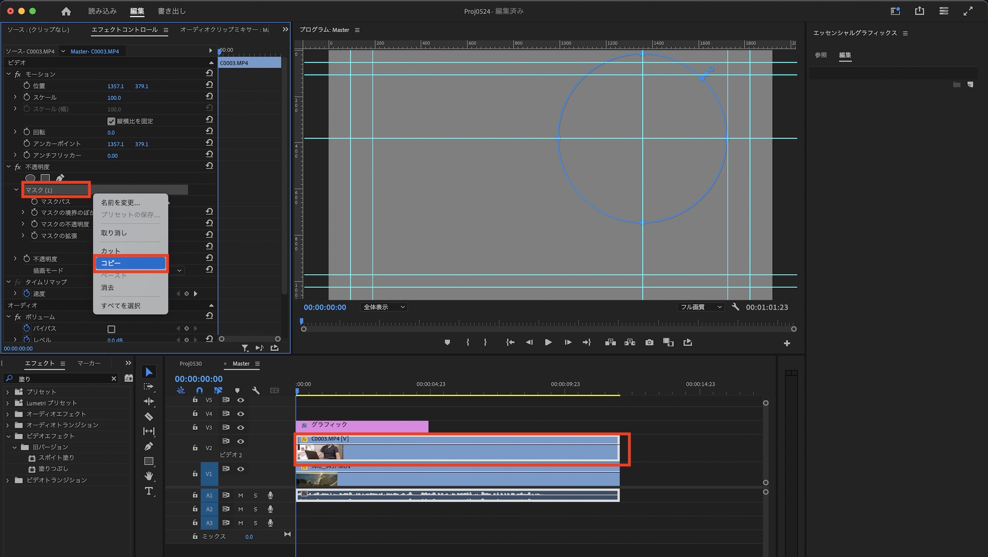PiPのクリップを選択し、エフェクトコントロールパネルの不透明度の「マスク」を選択、右クリックして「コピー」をします。