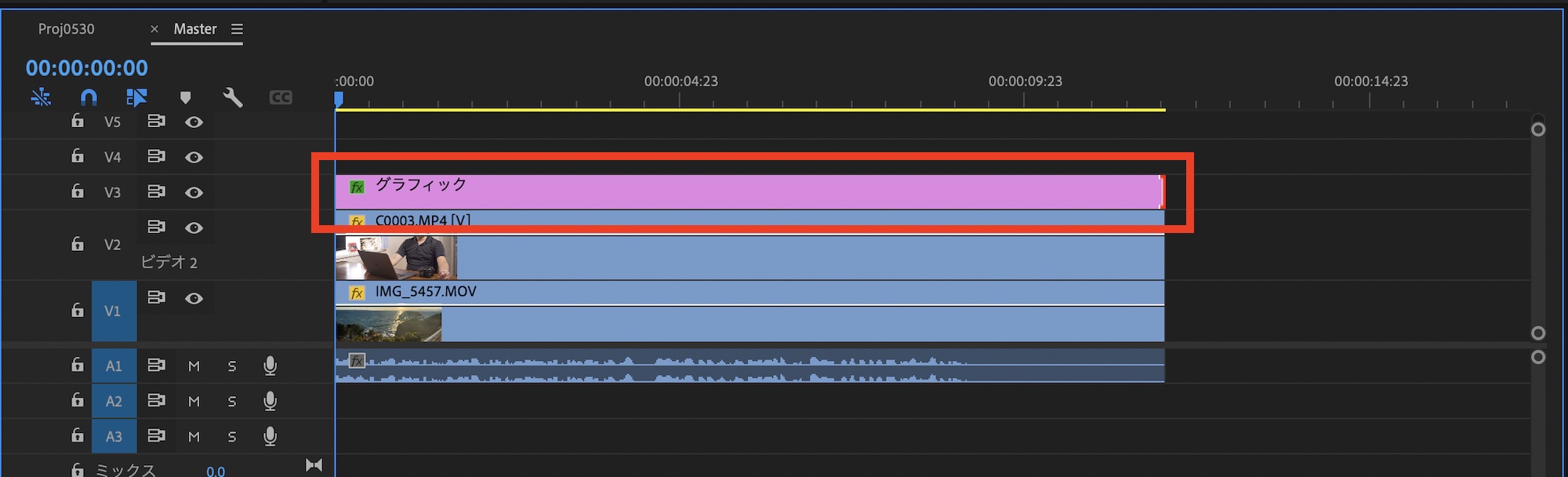 シーケンス上でシェイプのレイヤーをクリップの長さと同じになるように調整します。