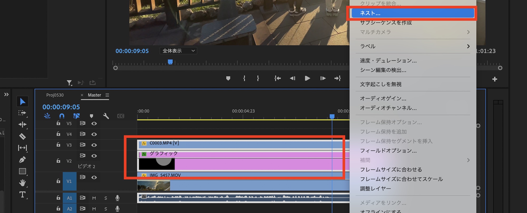 シェイプのレイヤーを選択し、エフェクトコントロールパネルの「モーション」の中にある「スケール」からサイズを変更し、枠線(縁)の幅を調整すれば完成です。シェイプとPiPのクリップをシーケンスで選択して、右クリック「ネスト」をクリックしてグループにします。