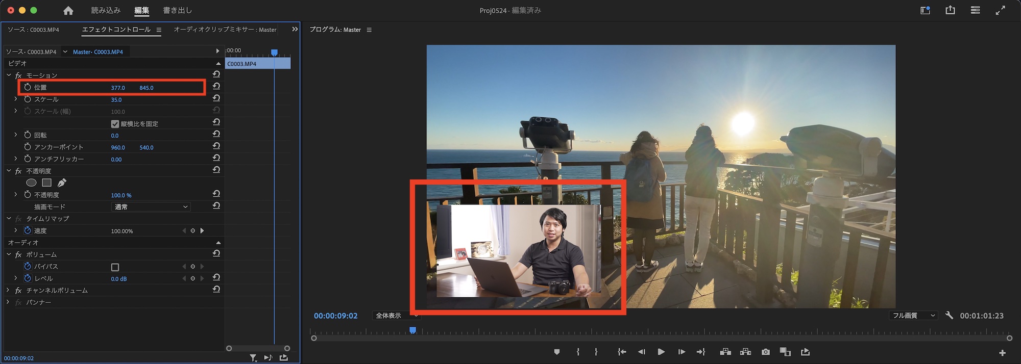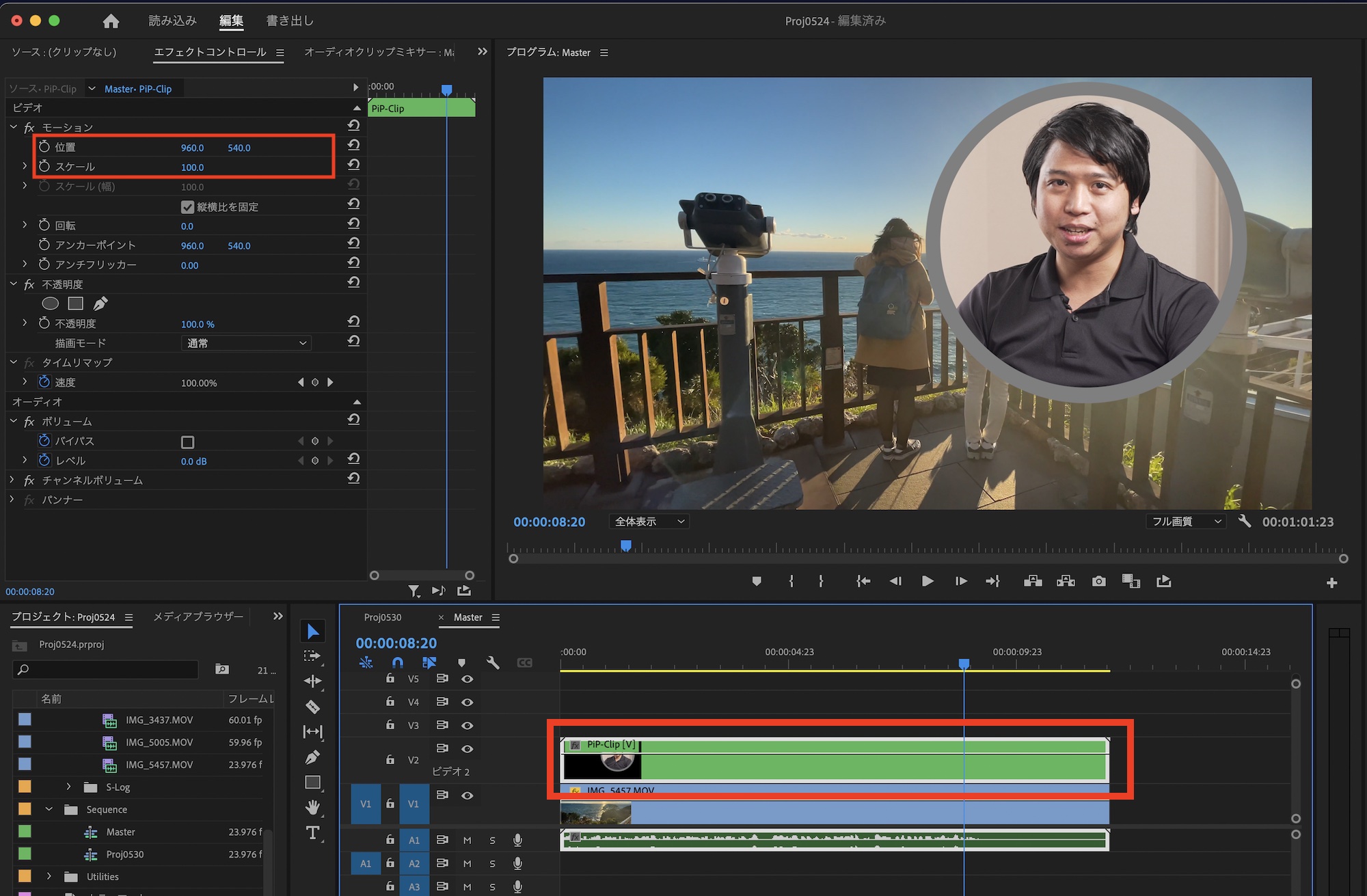 後は「モーション」にあるスケールと位置を変更し、ピクチャー・イン・ピクチャーを整えて完成です。
