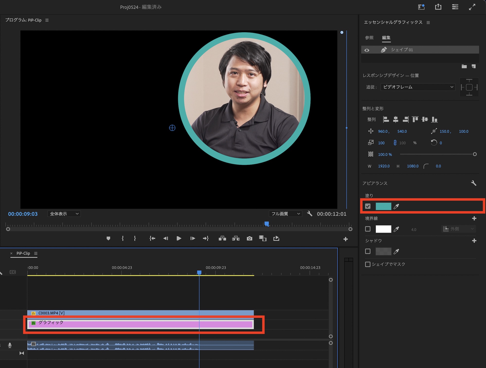 ピクチャー・イン・ピクチャー(ワイプ)に枠線を追加する方法として「塗りつぶし」のエフェクトを適用するやり方があるのですが、若干不安定かつカスタマイズ性が低いので、エッセンシャルグラフィックスを使った方法をご紹介します。