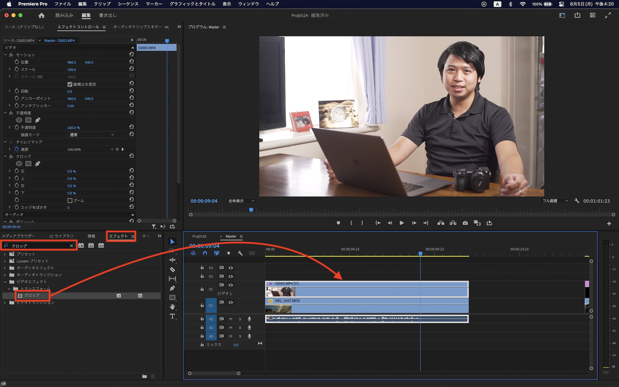エフェクトパネルの検索窓から「クロップ」と検索し、エフェクトをピクチャー・イン・ピクチャーに適用するクリップにドラッグ・アンド・ドロップします。