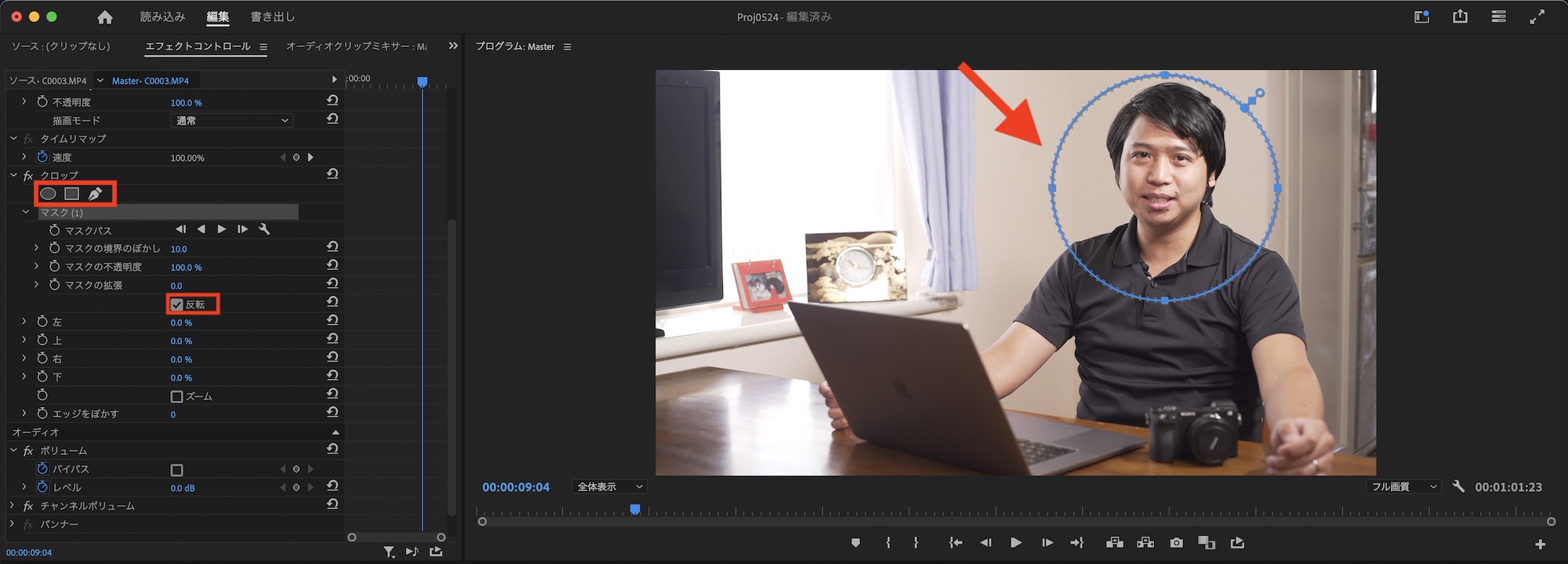 まず、PiPのクリップを不透明度のマスクで範囲を指定します。形などを整え、必要に応じて「マスクの境界のぼかし」を調整してください。