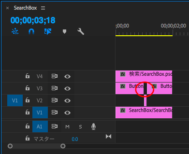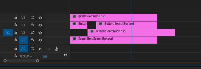 今回のシーケンスの場合はV1が検索窓、V2が押した時のエフェクト、V3がボタンのデフォルト状態、V4が「検索」の文字になっているので、しばらくV3を表示した後に数フレームV2を表示し、またV3を表示するようにトリムをします。