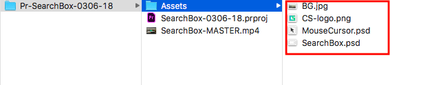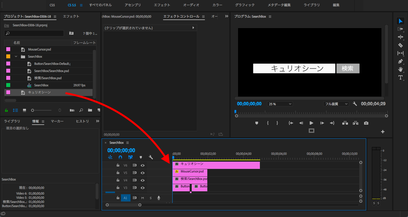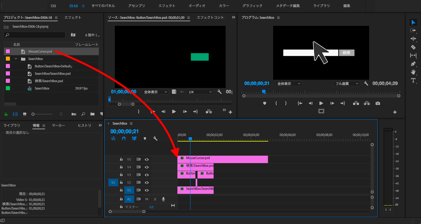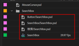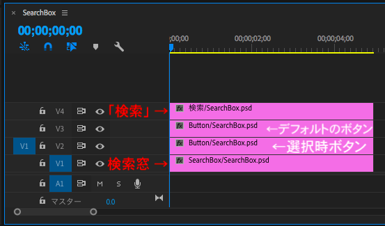 SearchBoxのシーケンスの中には先程Photoshopで使ったレイヤーがタイムライン上に現れるのですが、少し構造が変わってくるため注意が必要です。