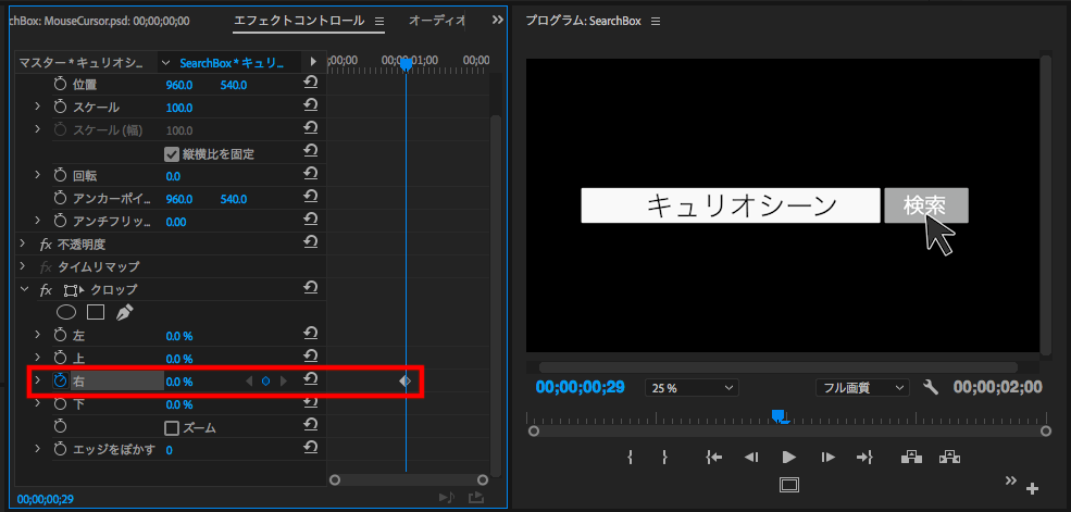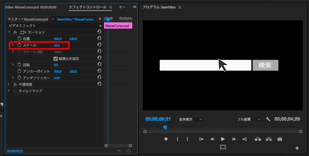 必要な尺に合わせてSearchBoxシーケンス上の素材を調整した後はマウスカーソルが上に乗った際のボタンエフェクトを作ります。