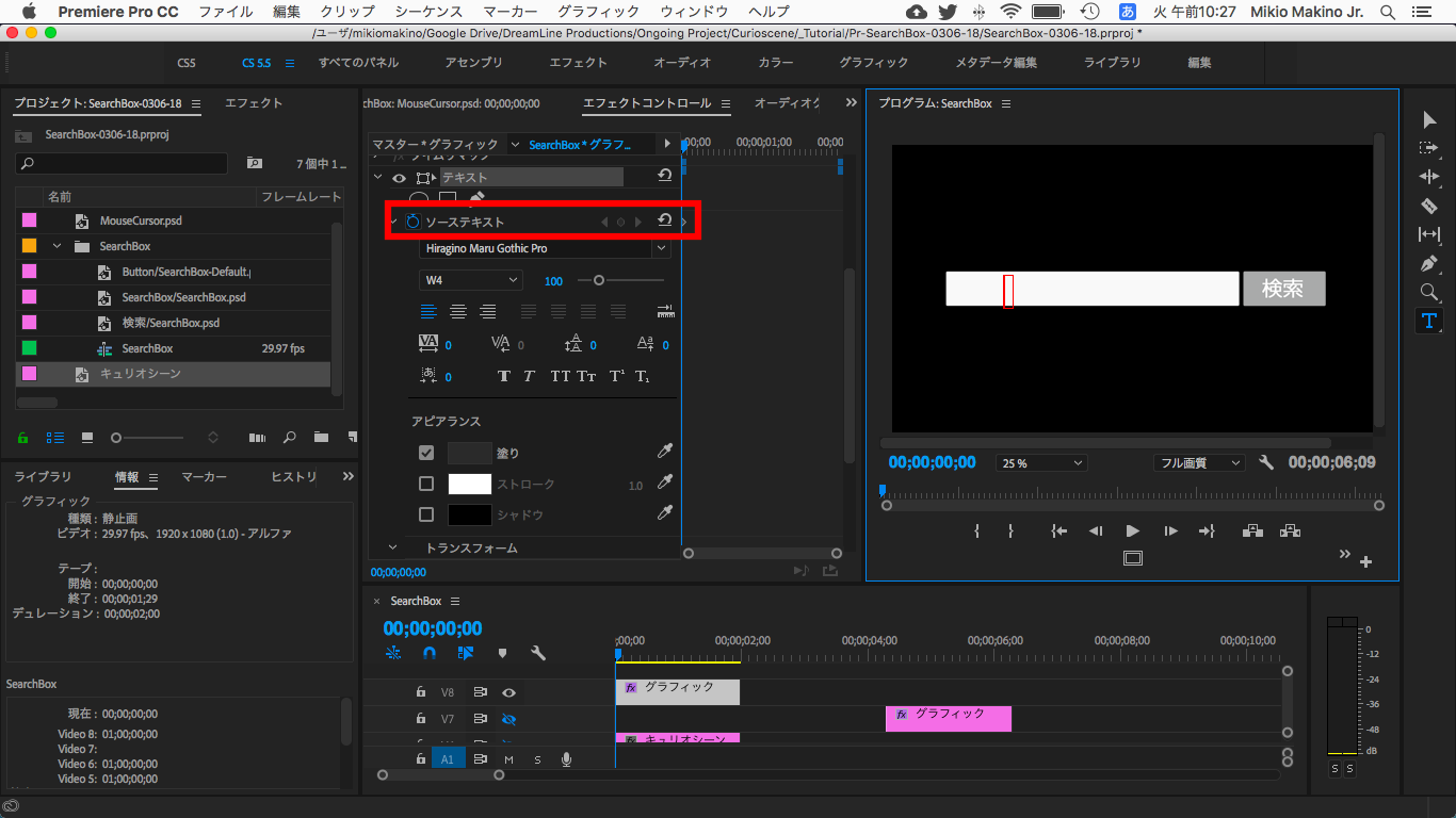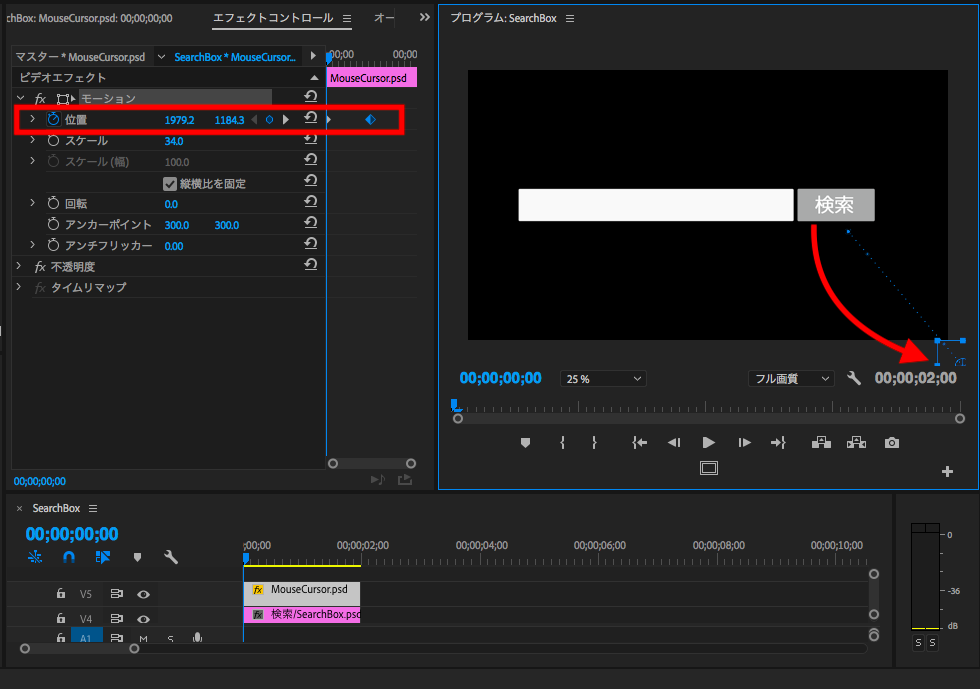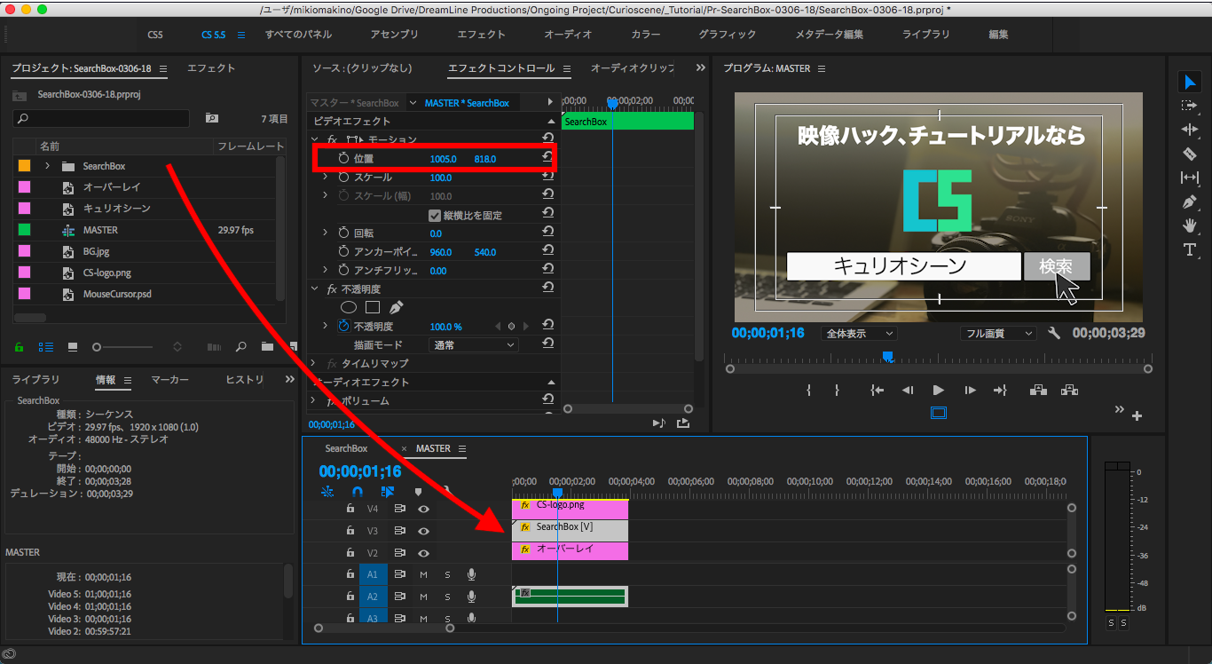 ここまで出来たら後はこのアニメーションを表示したい動画に載せるだけ。サンプルでは「MASTER」というシーケンスに先程作った「SearchBox」のシーケンスを挿入しています。後は「位置」などで表示する場所を調整して完了です。