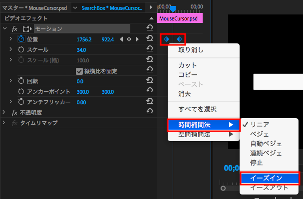 イージングは位置で付け足したキーフレームを選択して、右クリック「時間補間法」、「イーズイン」を選択します。するともう少し動きがスムーズになったのが分かると思います。最後はテキストの挿入です。