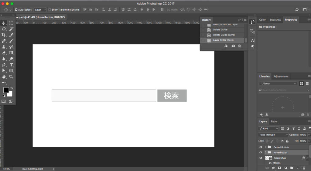 検索窓を左にボタンを右にセットして、検索ボタンはマウスがボタンの上に置く時に色が変わるよう、ホーバー用のボタンを複製して色を変更しました。
