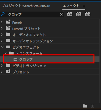 その後でシーケンスに挿入した後、エフェクトから「クロップ」を検索してタイトルに追加します。