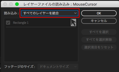 今度はPremiere Proを開いて、素材一式プロジェクトウィンドウにドロップします。PSDを読み込む際に「レイヤーファイルの読み込み」オプションが出てくるので、マウスカーソルの場合は「全てのレイヤーを統合」を選択します。