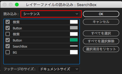 検索窓の際は読み込み方法を「シーケンス」にした上で、必要のない背景(BG)や複製されたボタンの文字「検索」のチェックを外します。