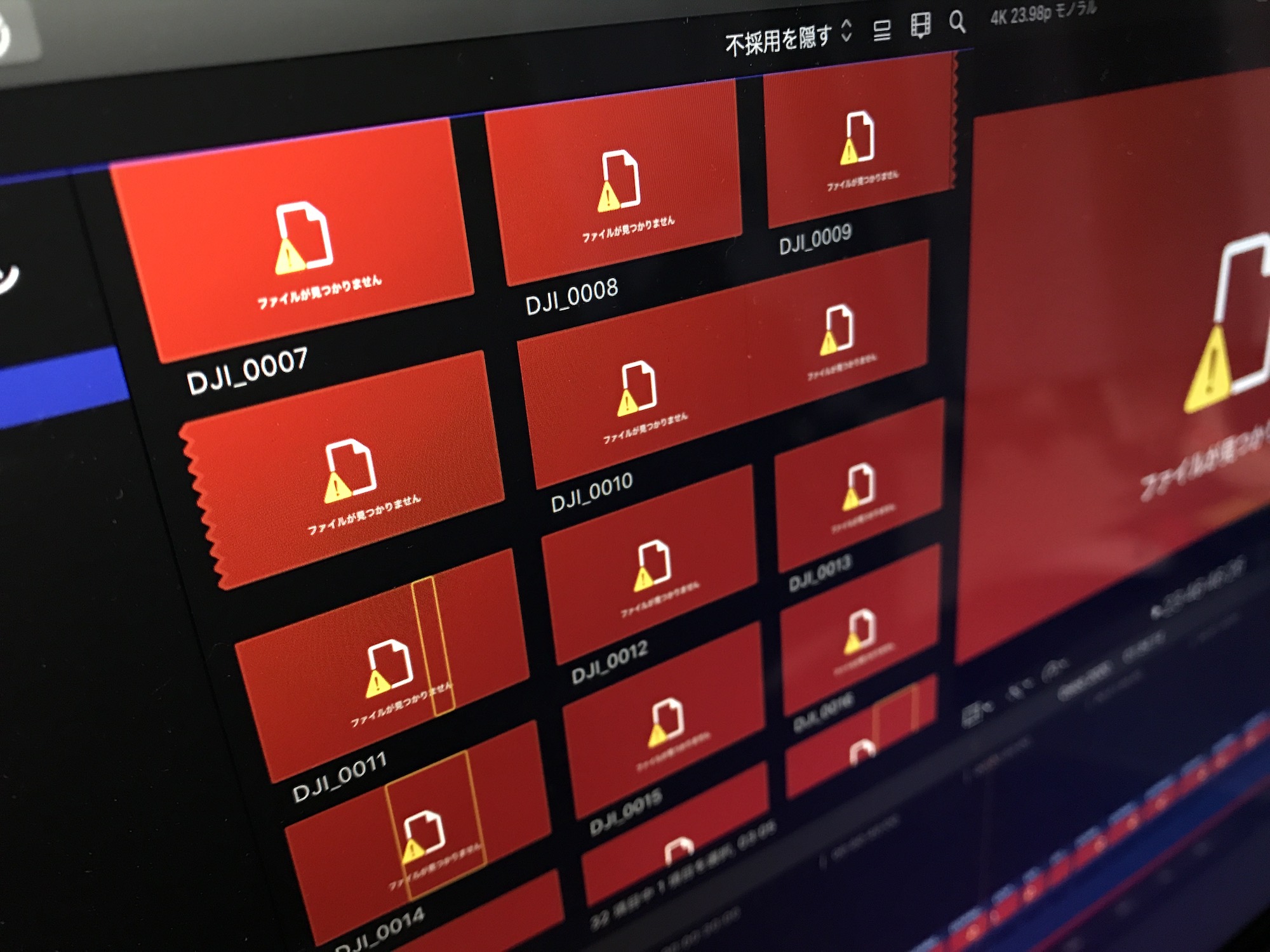 編集で使用する素材が接続されていない状態でFinal Cut Proを開くと、下の画像のようにビューアやブラウザ、タイムラインのクリップが全て赤色になり、「ファイルが見つかりません」と表示されています。