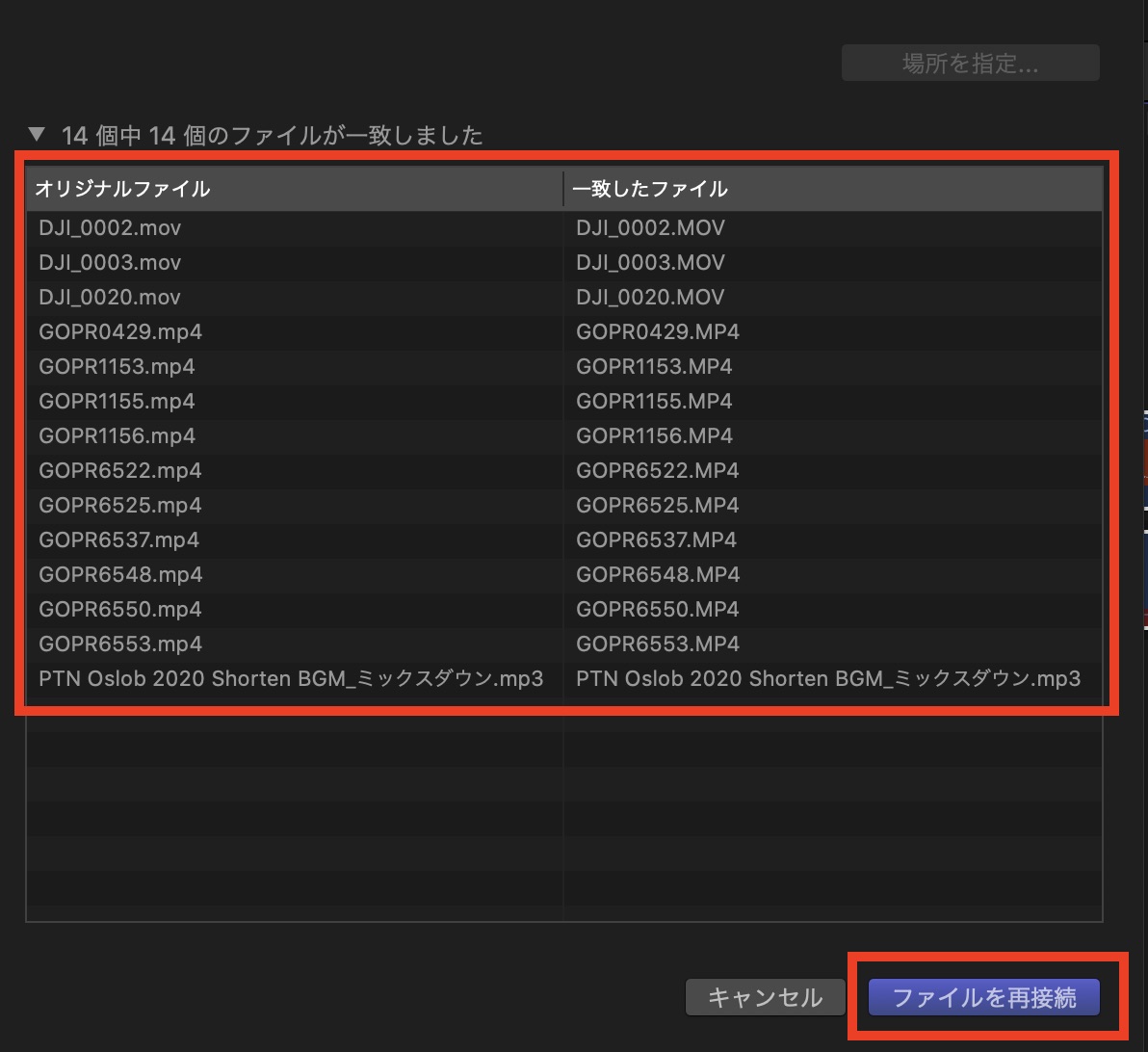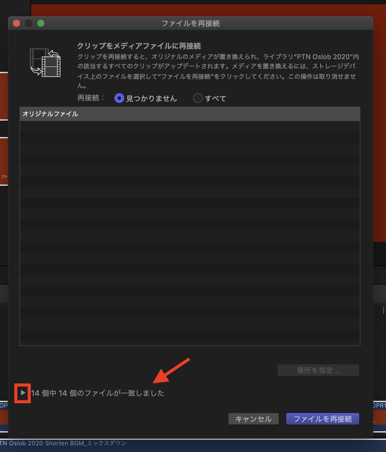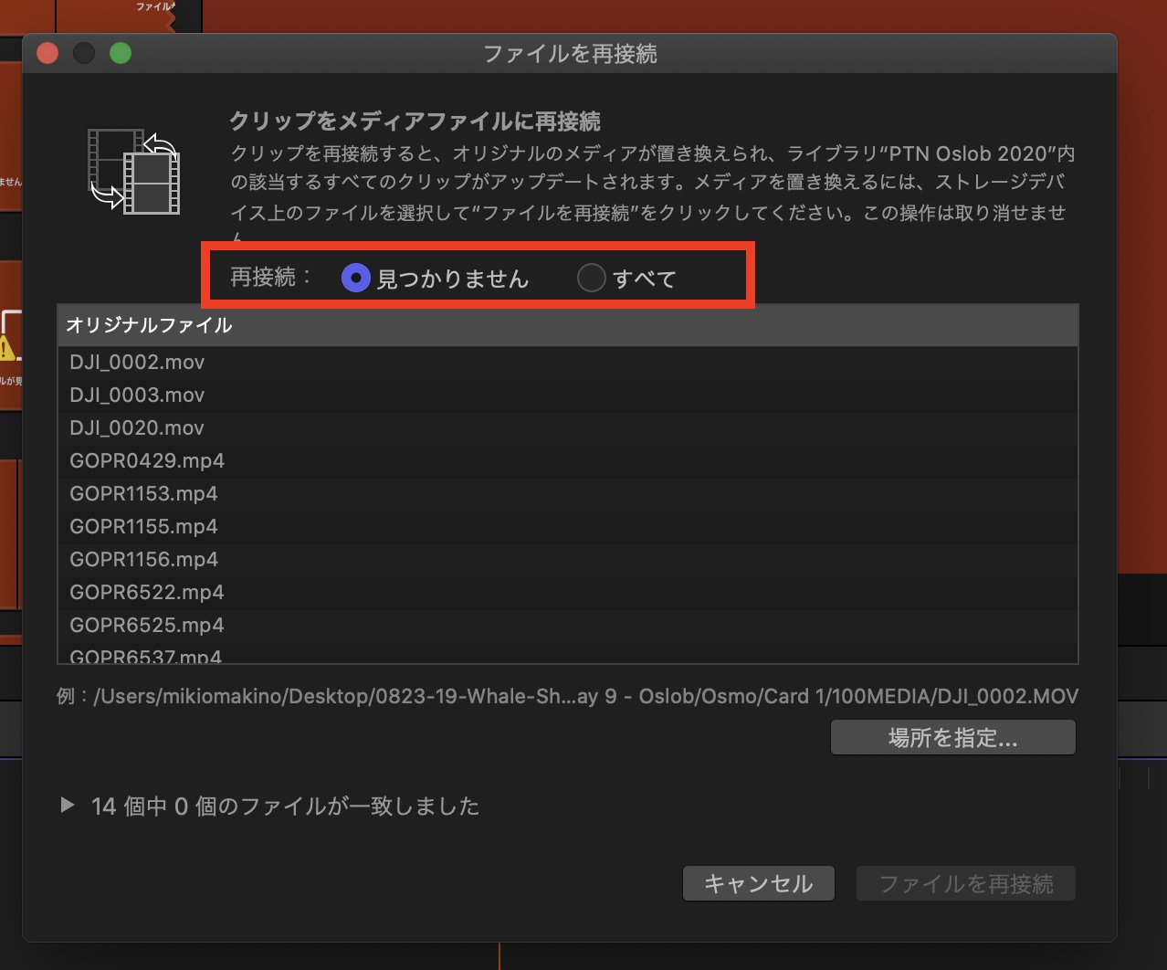 ライブラリ内にあるファイルを全て再接続させたい場合は「すべて」を選ぶと良いでしょう。