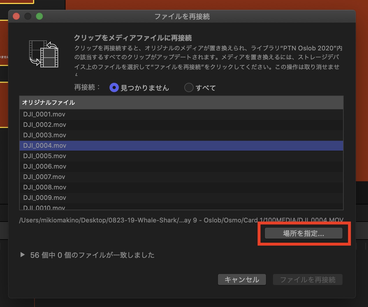 「場所を指定」のボタンから再接続するフォルダを選択します。HDDのトップレベルディレクトリにしても問題ありませんが、この場合だと検索に時間がかかるため、素材が保存してあるフォルダを選ぶようにしましょう。