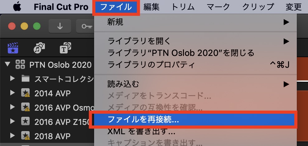 クリップを全て選択して、上部メニューの「ファイル」から「ファイルを再接続」をクリックしてツールを開きましょう。
