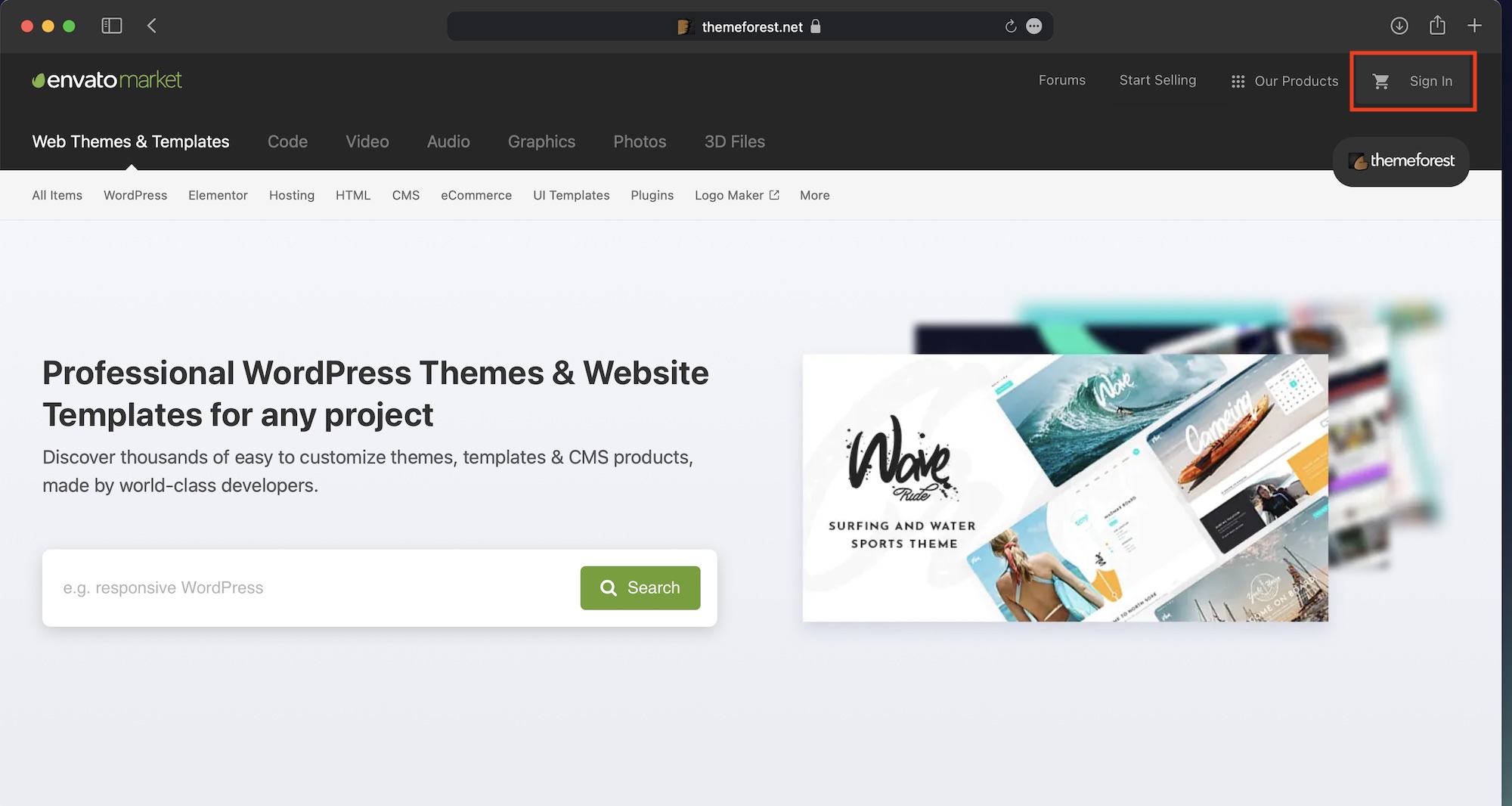 Envato Marketのサイトにアクセスし「Sign In」をクリックします。トップページはThemeForestとなっていますが、他のサービスからアクセスしても同じ方法になります。