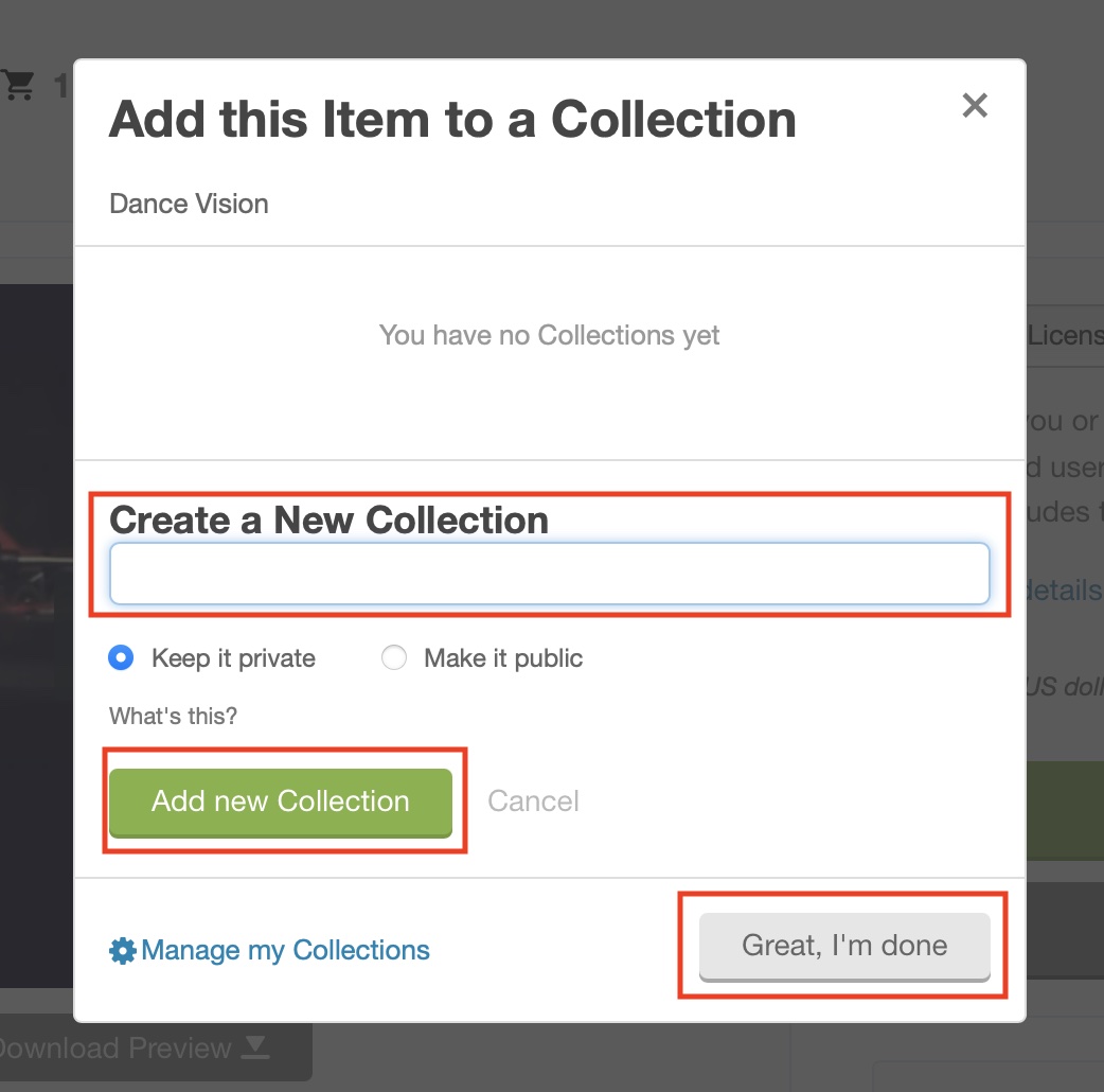 「Add to Collection」の場合は「Add this Item to a Collection」のウィンドウが現れるので、「Create a New Collection」でコレクション名(フォルダ名)を入力し、「Add new Collection」をクリックします。完了したら「Great, I’m done」をクリックしましょう。