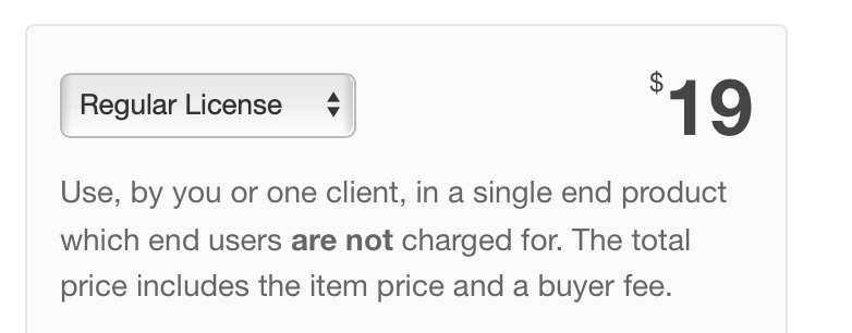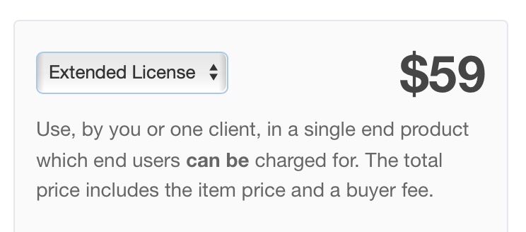 Envato Marketで販売されているアイテムの多くはこのスタンダードライセンスが付与されており、その中は「Regular License(通常ライセンス)」と「Extended License(拡張ライセンス)」の2種類があります。選ぶライセンスによって価格も変わるので注意しましょう。