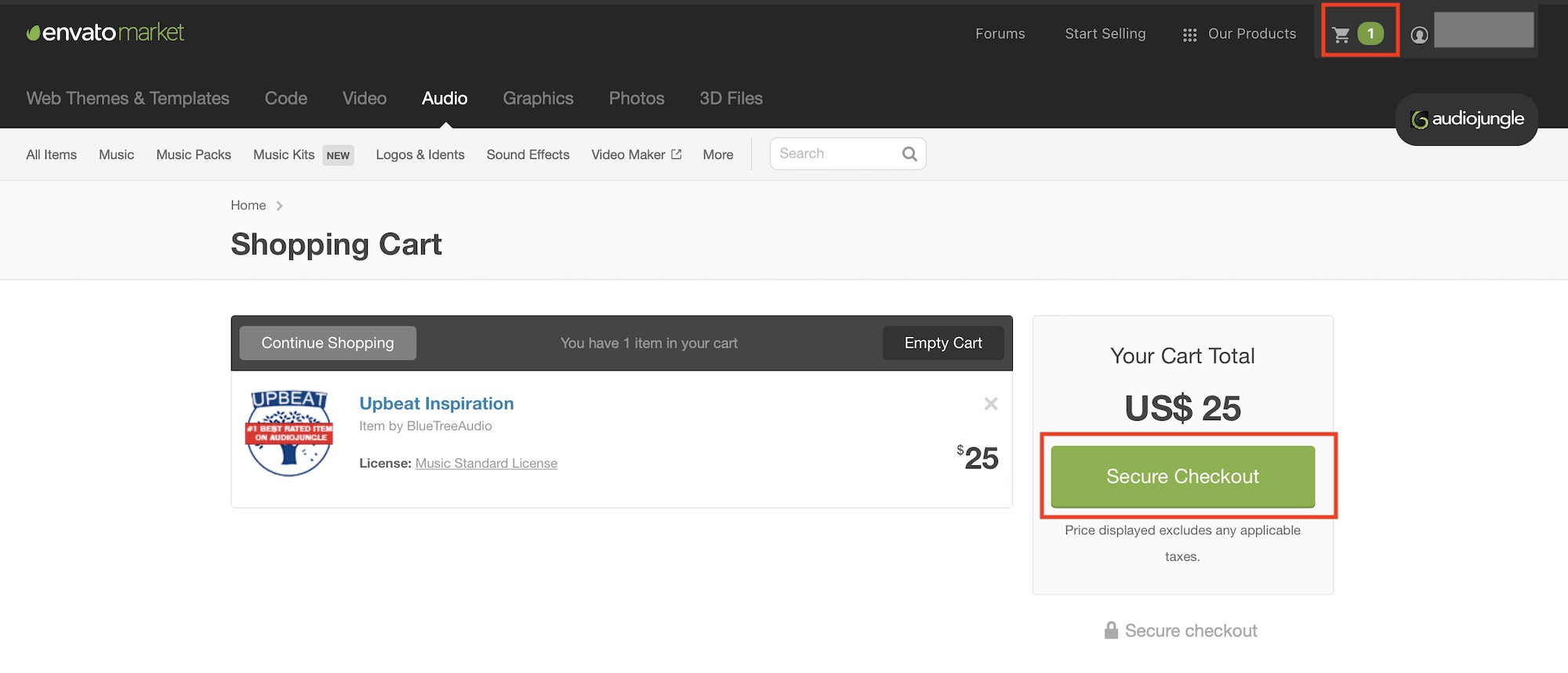 「Add to Cart」をクリックした場合は上部のカートアイコンをクリックするとカートの内容を確認できます。購入を続ける場合は「Secure Checkout」をクリックしましょう。