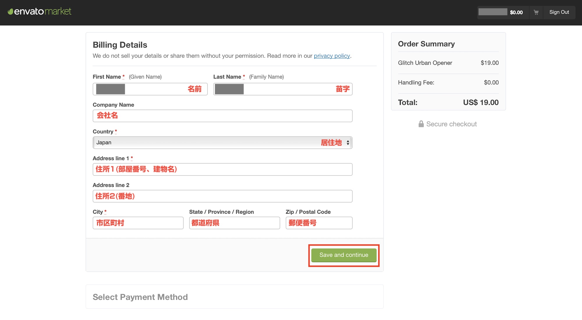 「Buy Now」またはカートの「Secure Checkout」をクリックすると、購入画面に進むので「Billing Details」に請求先情報を入力し、「Save and Continue」をクリックします。