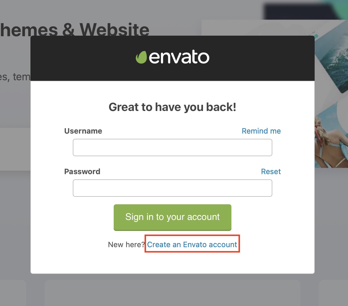 ログイン画面が現れるので、「Create an Envato account」をクリックします。