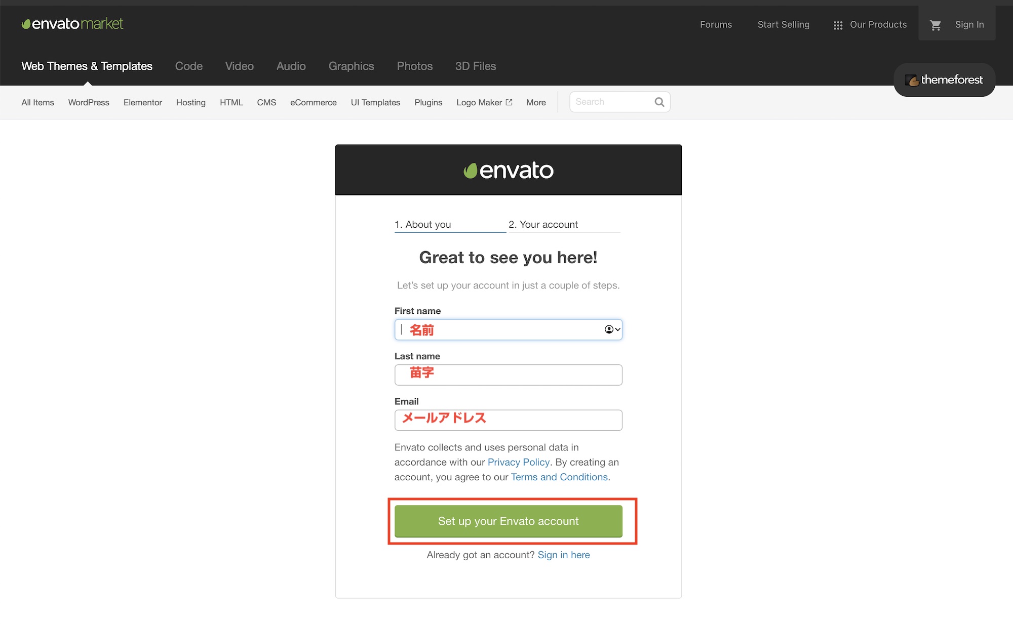 「About You」の項目では名前、苗字、メールアドレスを入力し、「Set up your Envato account」をクリックしましょう。