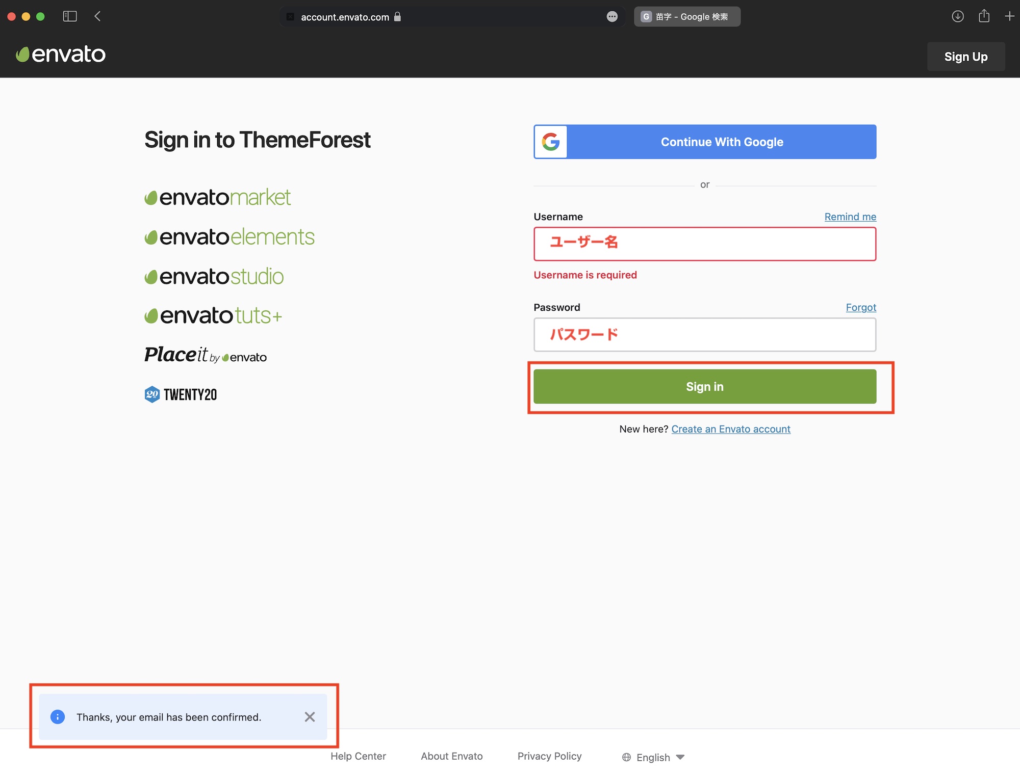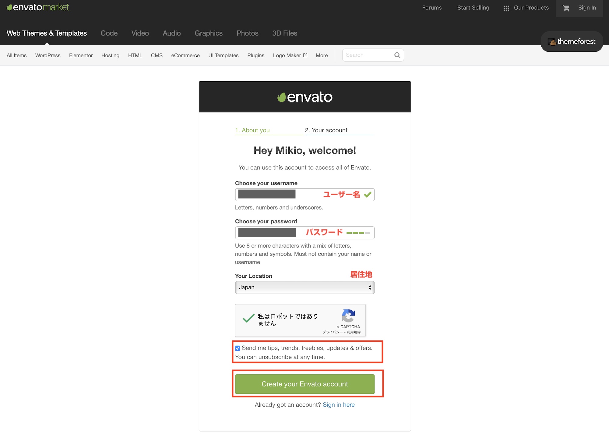 入力を完了したら「Create your Envato account」をクリックします。