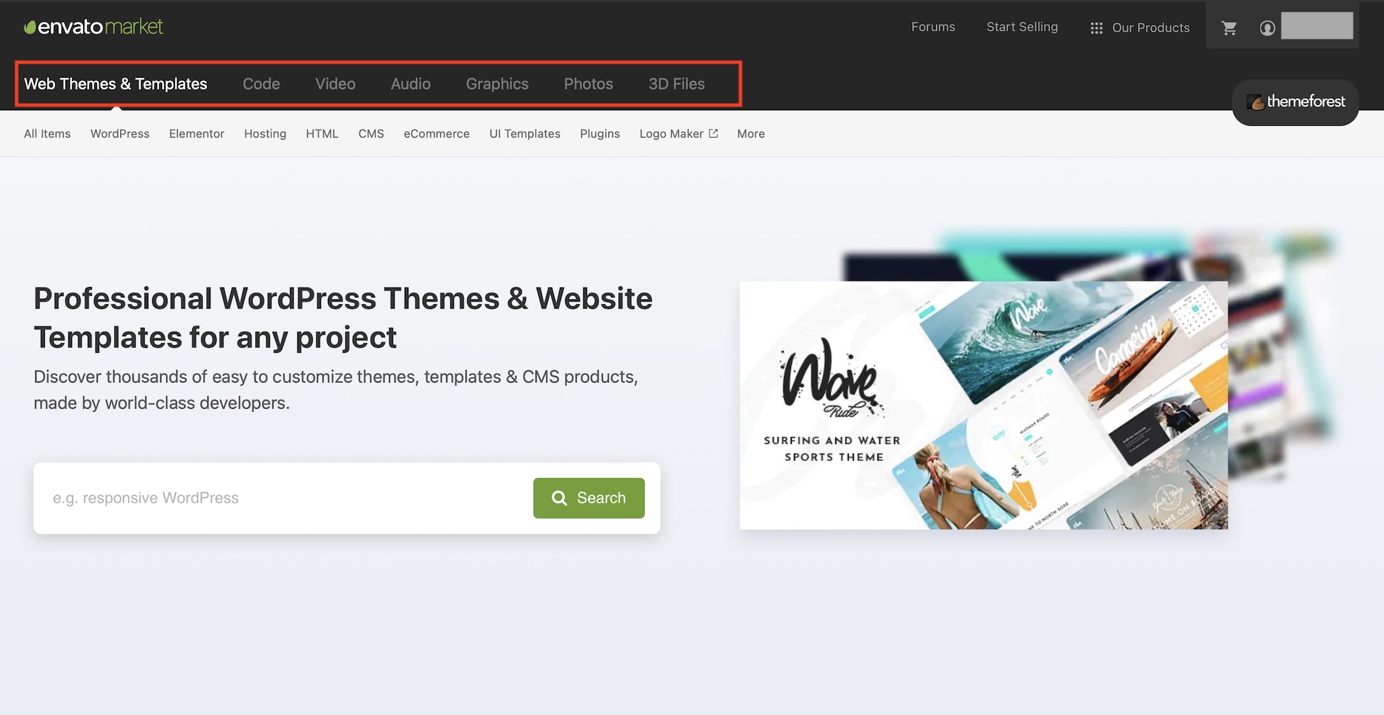 上部メニューのWeb Themes&Template(ウェブサイトテーマとテンプレート)、Code(コード)、Video(ビデオ)、Audio(オーディオ)、Graphics(グラフィック)、Photos(写真)、3D Files(3Dファイル)から見つけたいアイテムのカテゴリをクリックしてそれぞれのページに移りましょう。