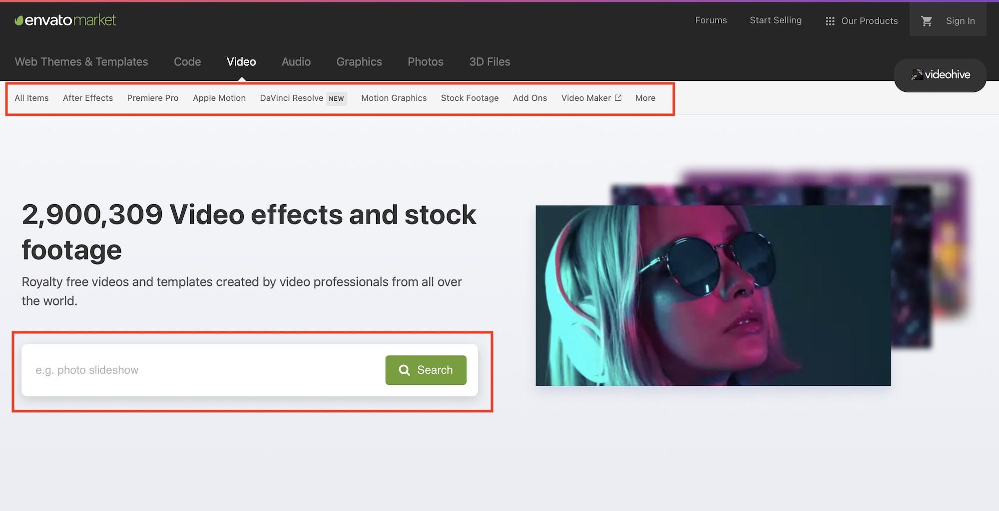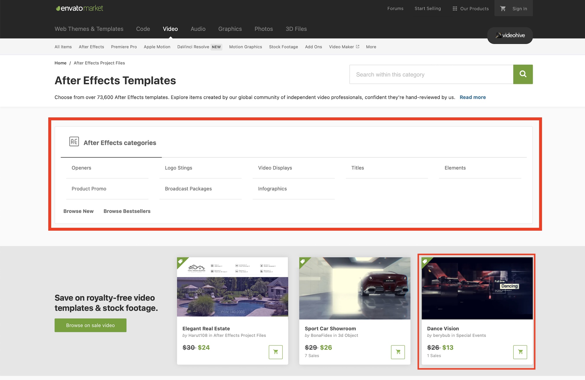 今回はAfter Effectsのテンプレートを探したいので、「Video」をクリックしましたが、どのページを選んでも基本的な操作は同じになります。