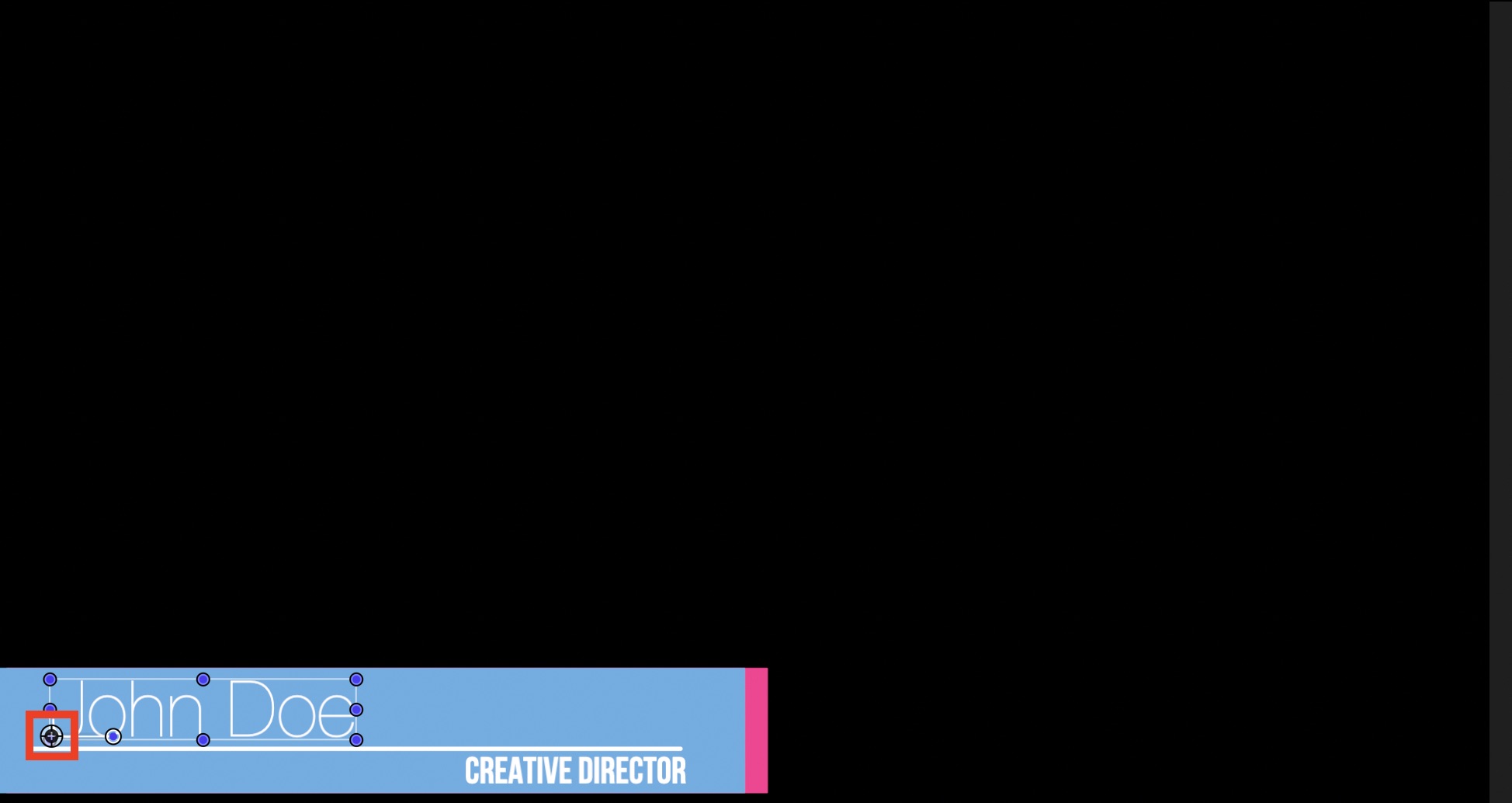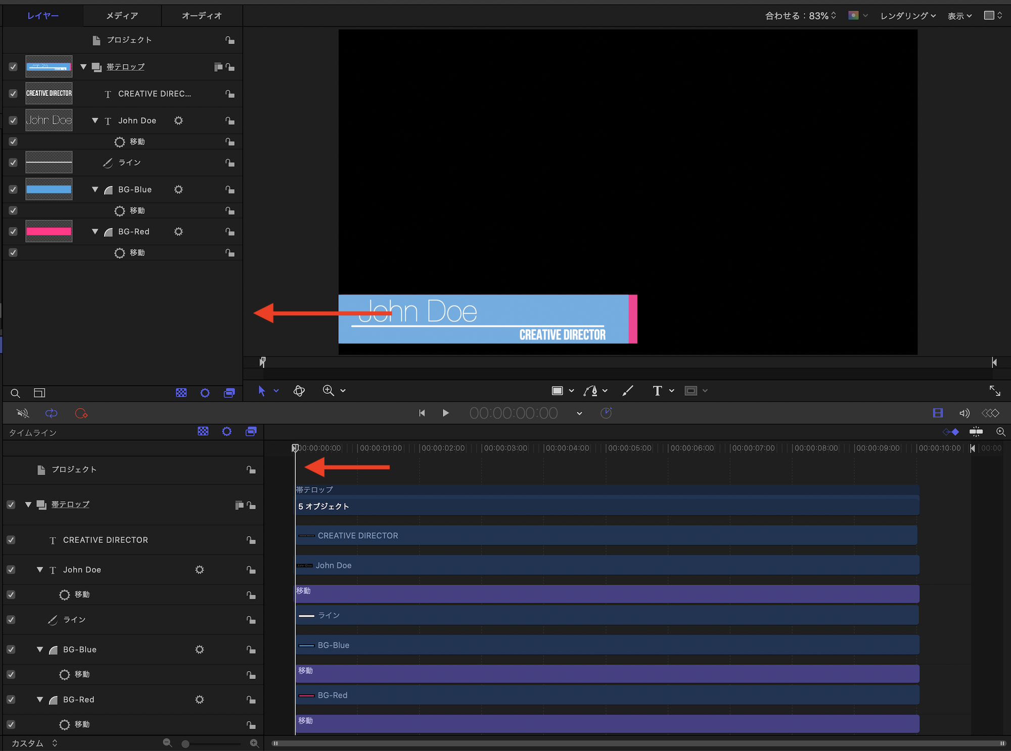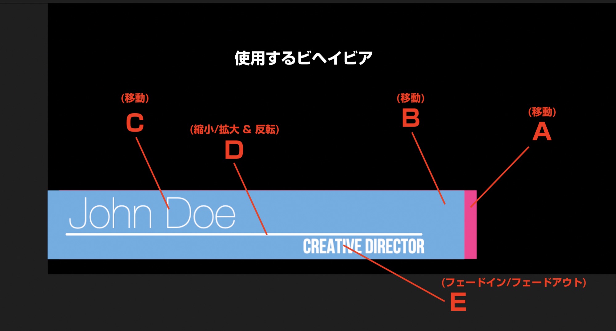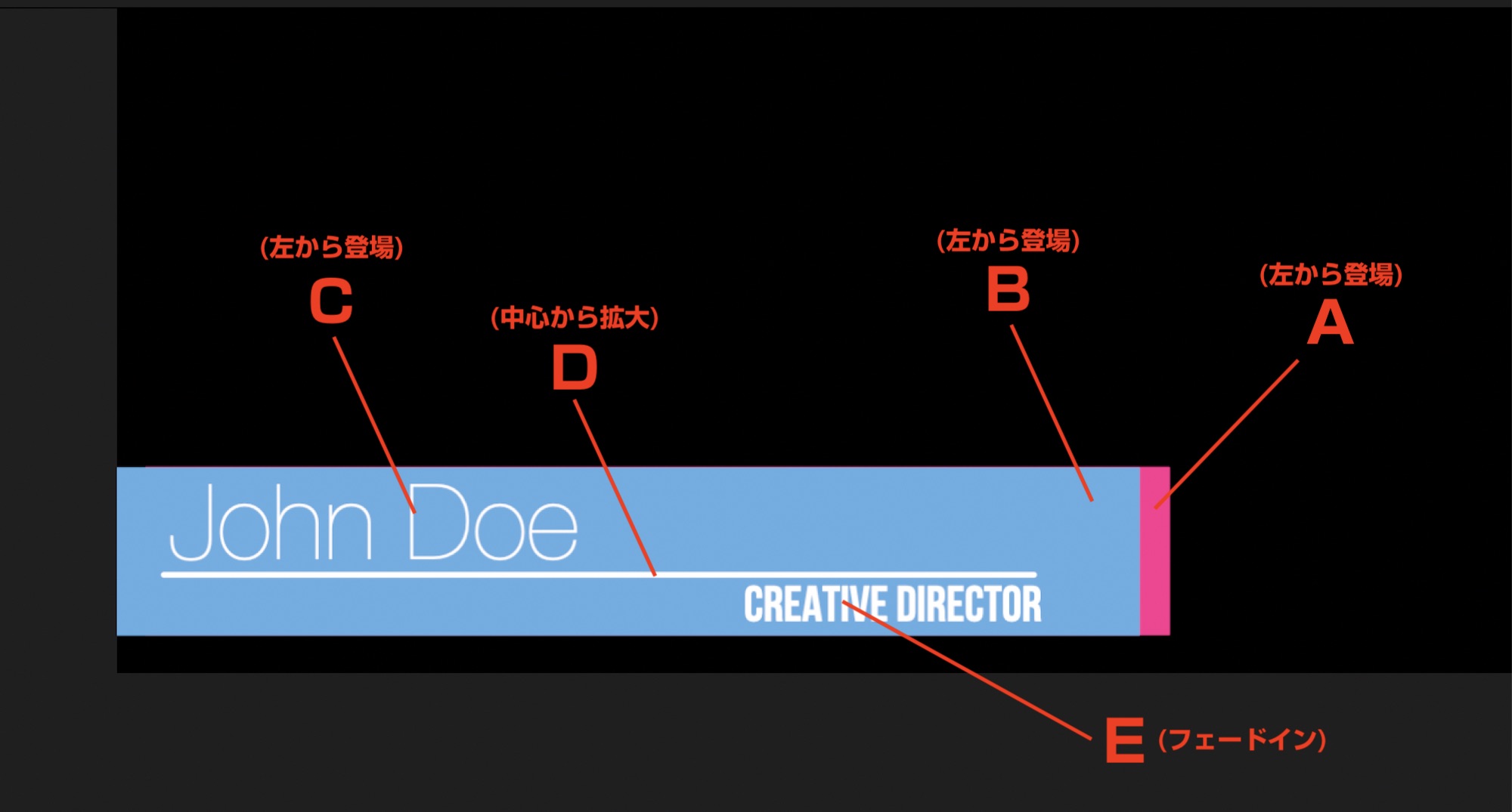こちらの記事で作成した帯テロップのデザインではピンク(A)と青のシェイプ(B)、「John Doe」の名前部分(C)、シェイプの中にある線(C)、そして「Creative Director」の役職名(E)の5つのオブジェクトを用意しています。