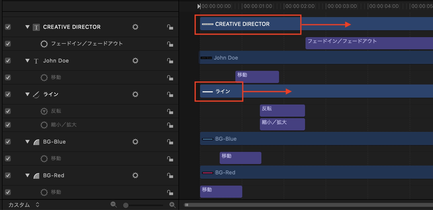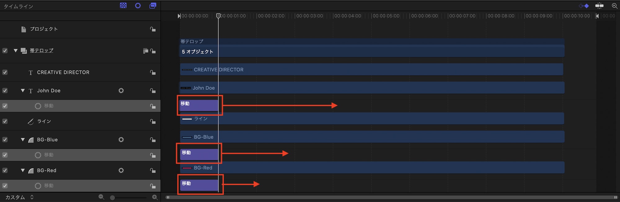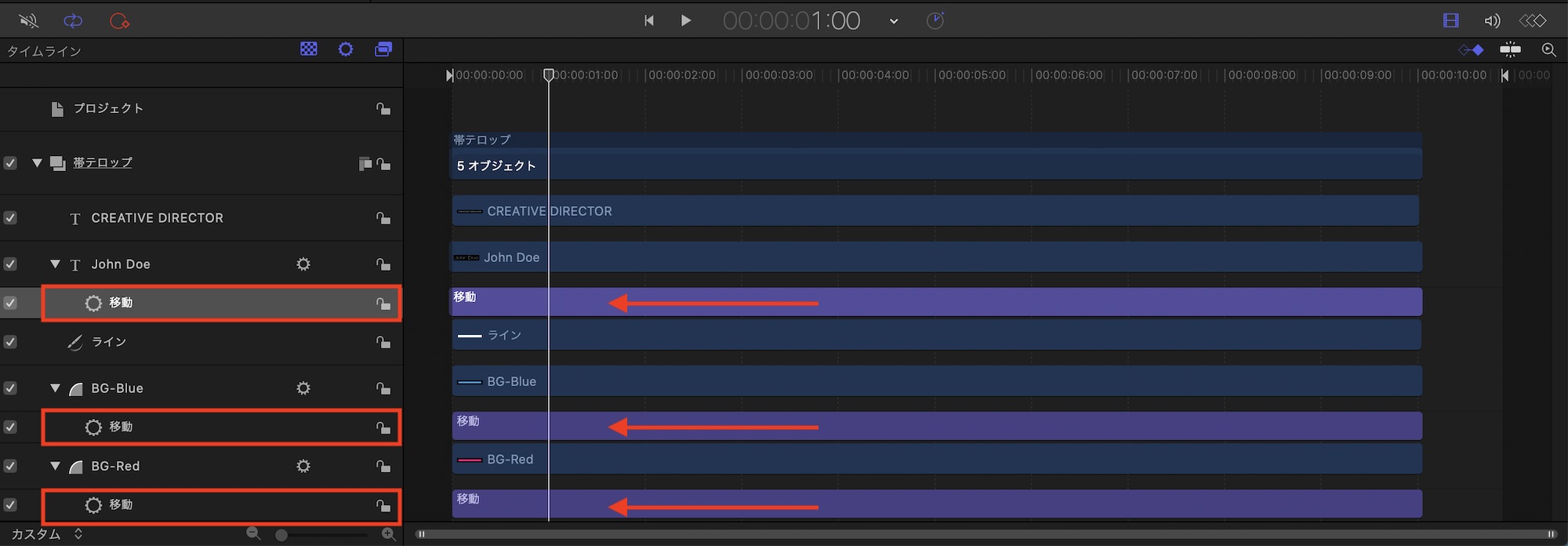 フレーム左から登場させる2つのシェイプと名前部分のテキストのオブジェクトは「基本モーション」内にある「移動」を使っていきます。