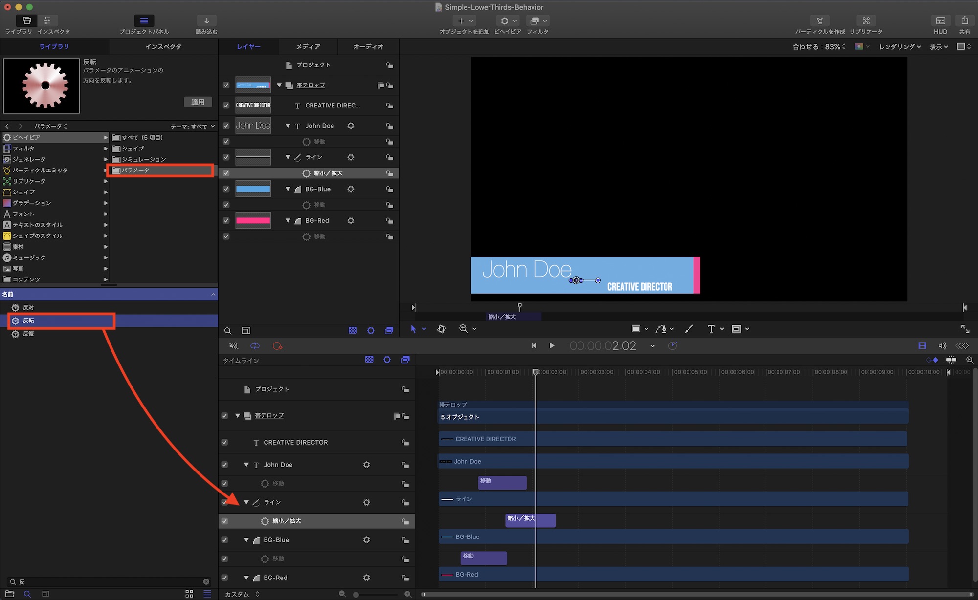 次に「パラメータ」の中にある「反転」を線のオブジェクトに追加し、「縮小/拡大」のビヘイビアと同じ長さになるように調整します。