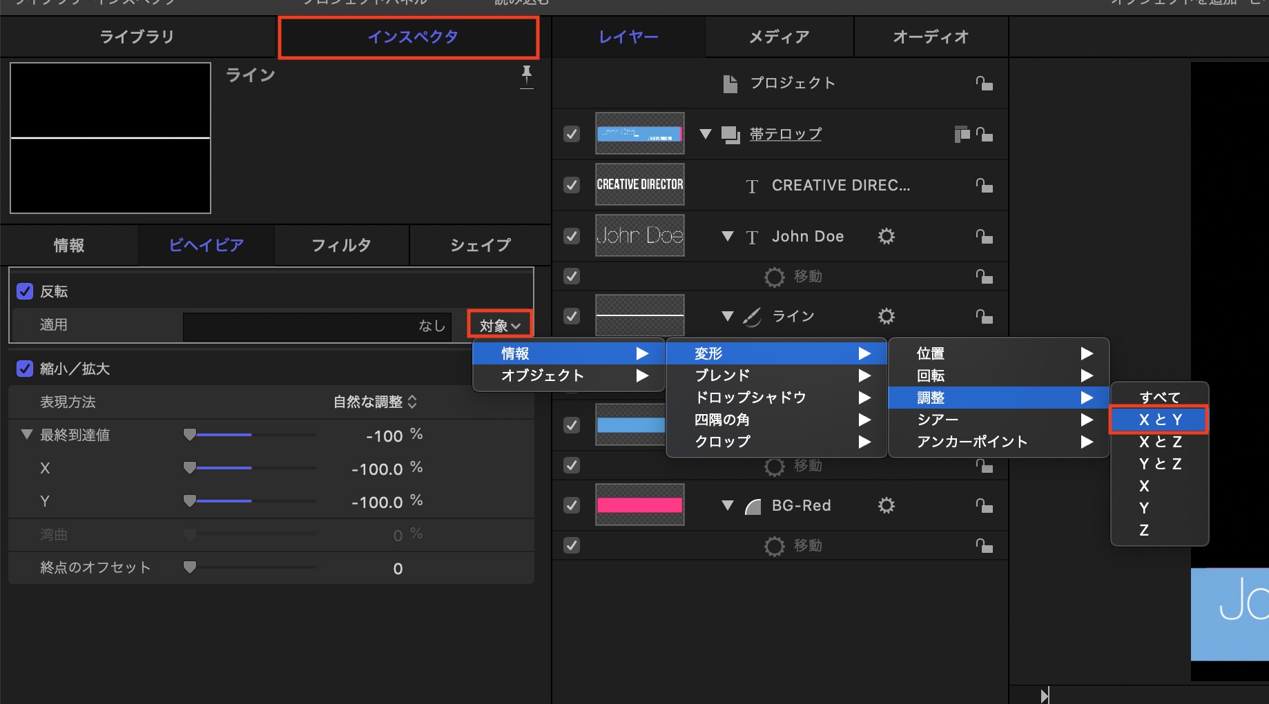 「反転」ビヘイビアを選択して、インスペクタ内にある「適用」の「対象」の項目から「情報 / 変形 / 調整」内にある「X と Y」を選択しましょう。