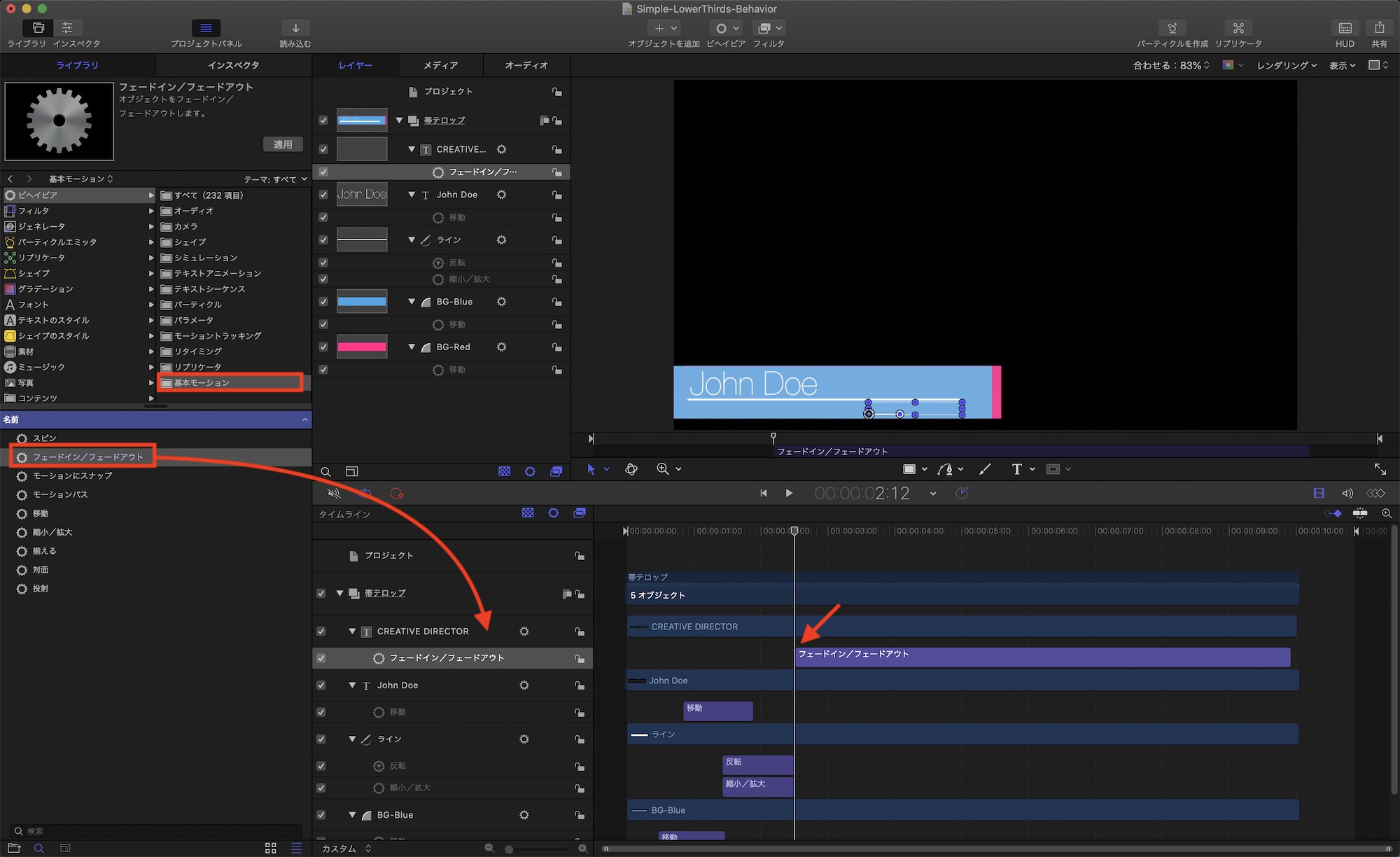 最後は「Creative Director」の役職部分の調整です。こちらはフェードインだけなので「基本モーション」の中にある「フェードイン/フェードアウト」のビヘイビアをテキストレイヤーに追加しましょう。