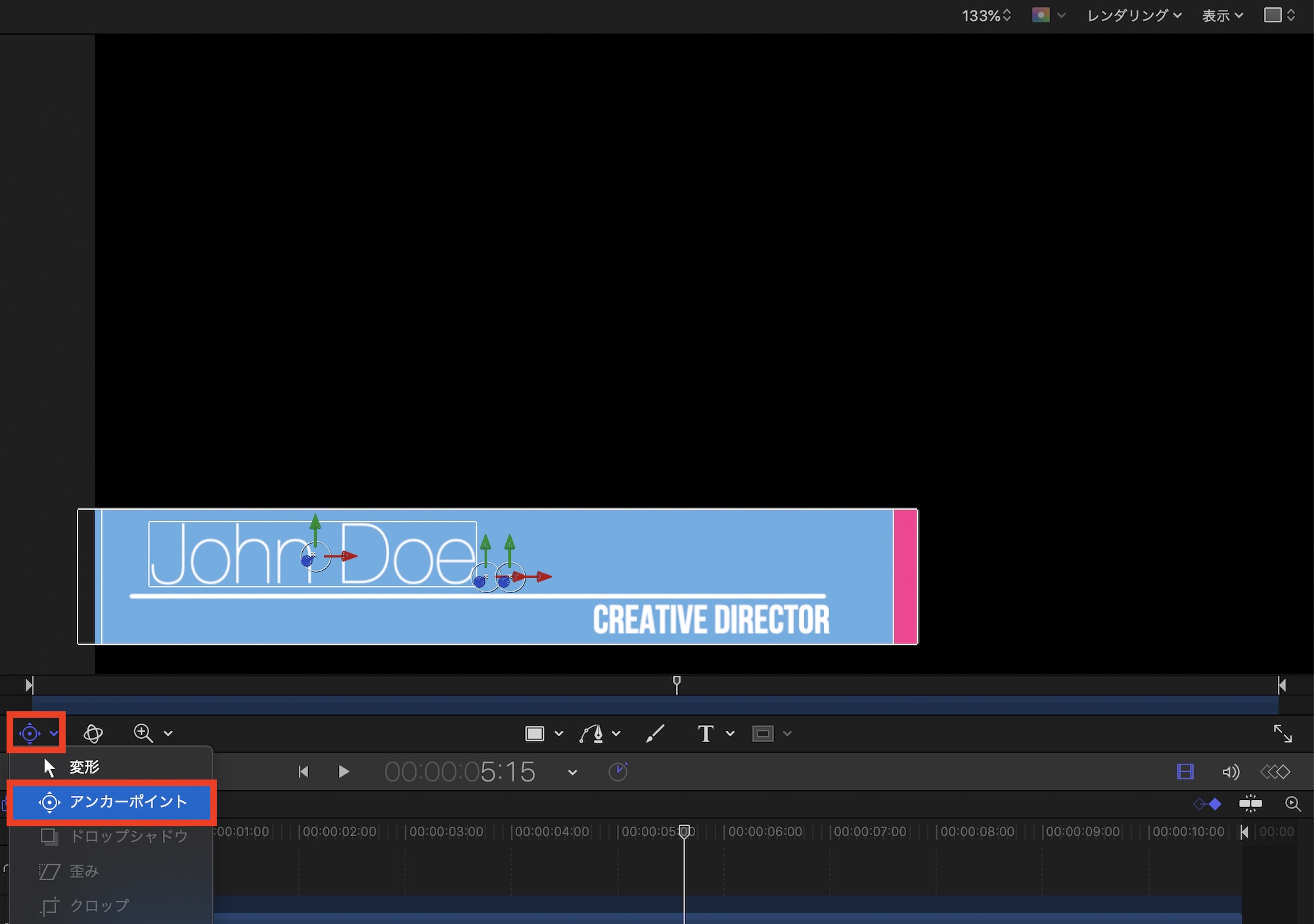 まず、2つのシェイプと名前のテキストレイヤーのアンカーポイントがオブジェクトの中心に配置していることを確認します。アンカーポイントの変更はツールバーにある「アンカーポイント」を選択して調整できます。