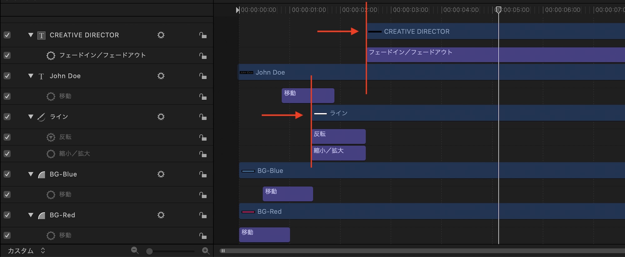 線のシェイプが現れたタイミングにテキストを表示させたいので、タイムインジケーターを動かし、「フェードイン/フェードアウト」を適用させます。
