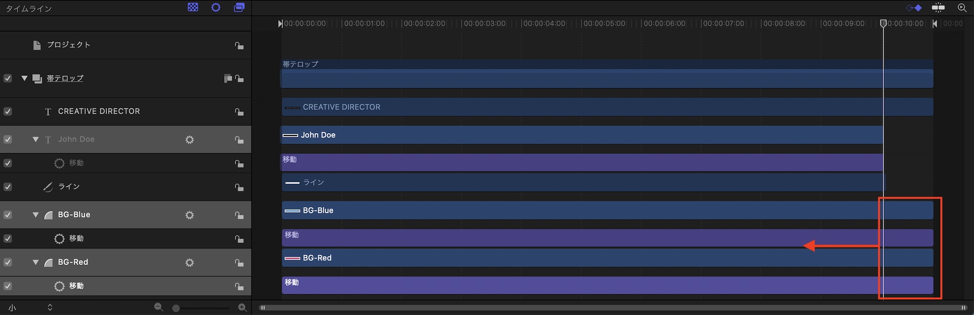 手動だと位置がずれる可能性があるので、タイムラインで3つのオブジェクトを選択して、「インスペクタ」から「情報」、「変形」内にある「位置」のX軸をスライドさせると良いでしょう。