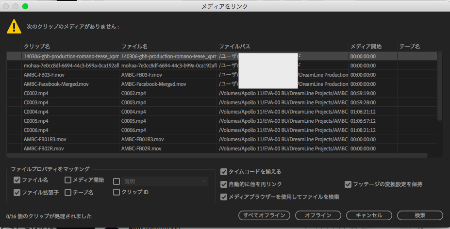 Adobe Premiere Proでは接続できなくなったオフラインの素材を再リンクできるツールが用意されており、それを利用する事で再接続を行うことが出来るのですが、ツールの使い方以外にもいくつか覚えておくと良いことを紹介したいと思います。