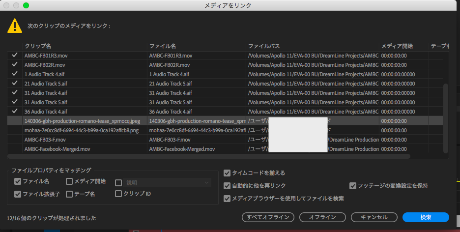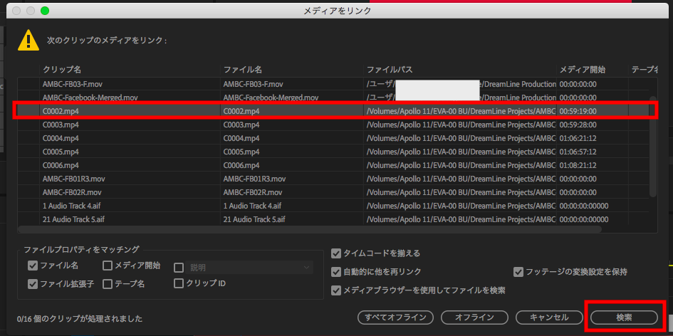 まず保存先の外付けHDDなどが接続されている状態でPremiere Proを開くとメディアのリンクのツールボックスが起動すると思うので、再リンクを行いたいファイルを一つ選択して右下にある「検索」のボタンをクリックします。