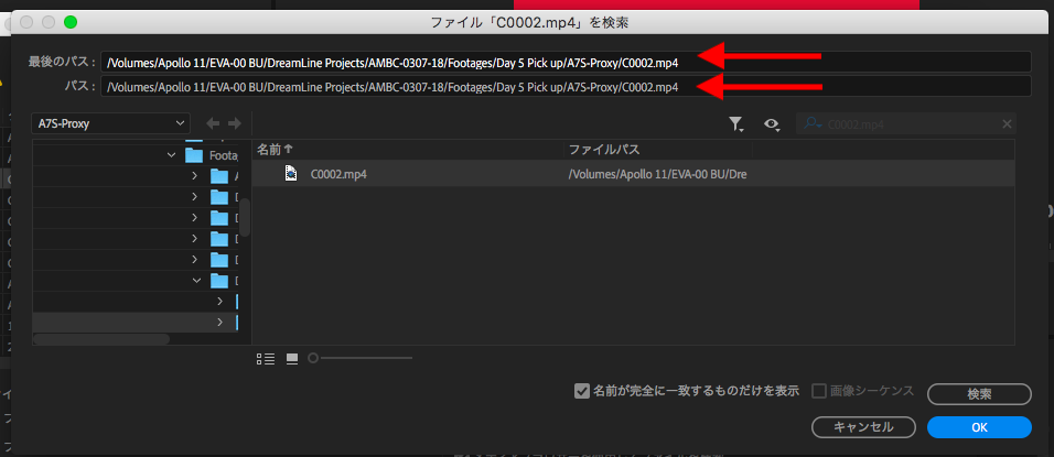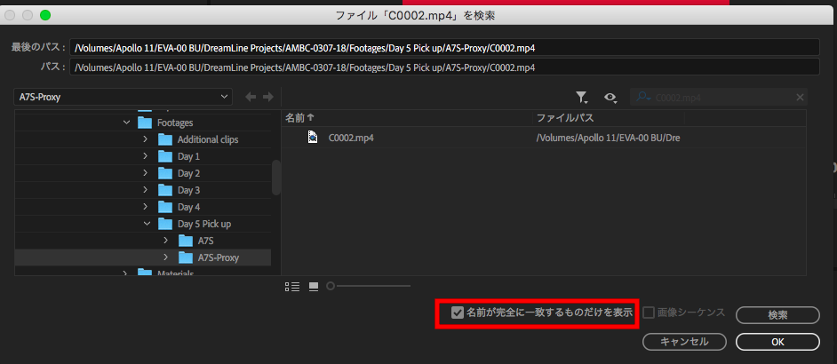 素材によっては同じファイル名で違う内容になっているものもあると思うので、上部の「最後のパス」で元の保存先を確認しながら、検索結果で表示中の「パス」と比較して同じかどうかチェックしましょう。素材が見つかったら、対象のファイルを選択して「OK」をクリックします。