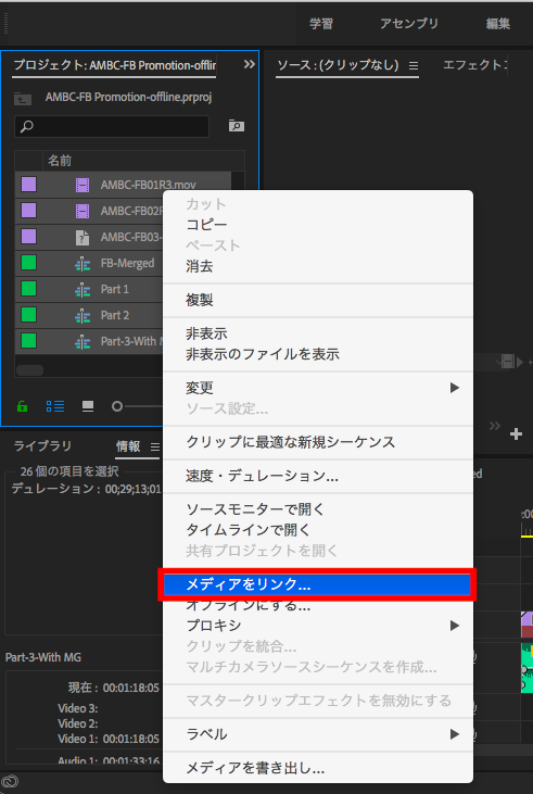 オフラインメディアを再接続する際、多くの場合は標準で搭載されている「メディアをリンク」のツールを使用することで素材をリンクする事が出来ます。